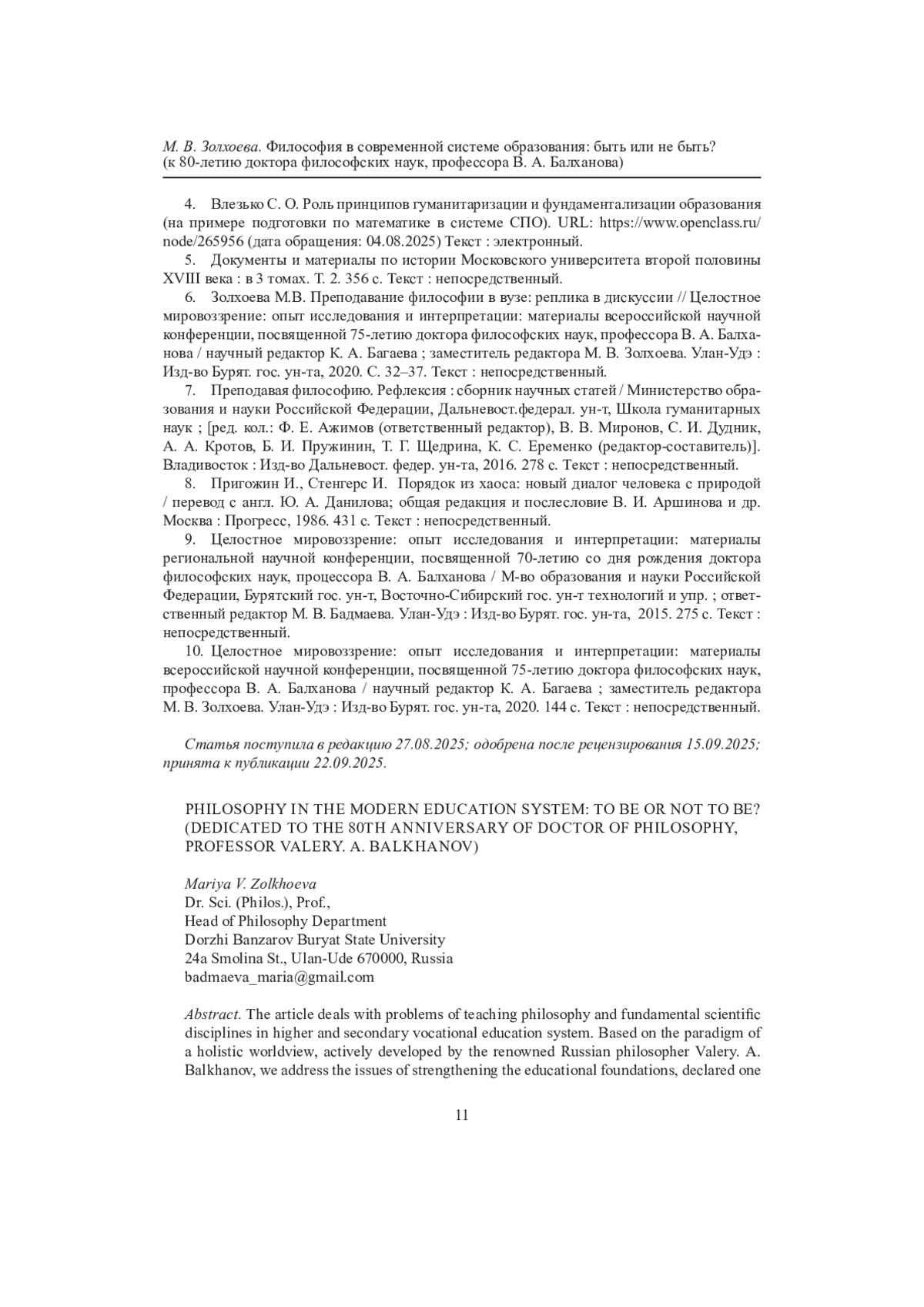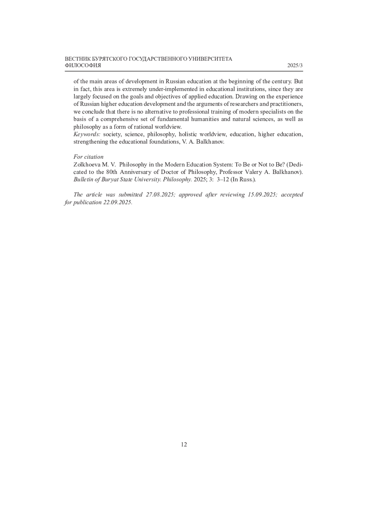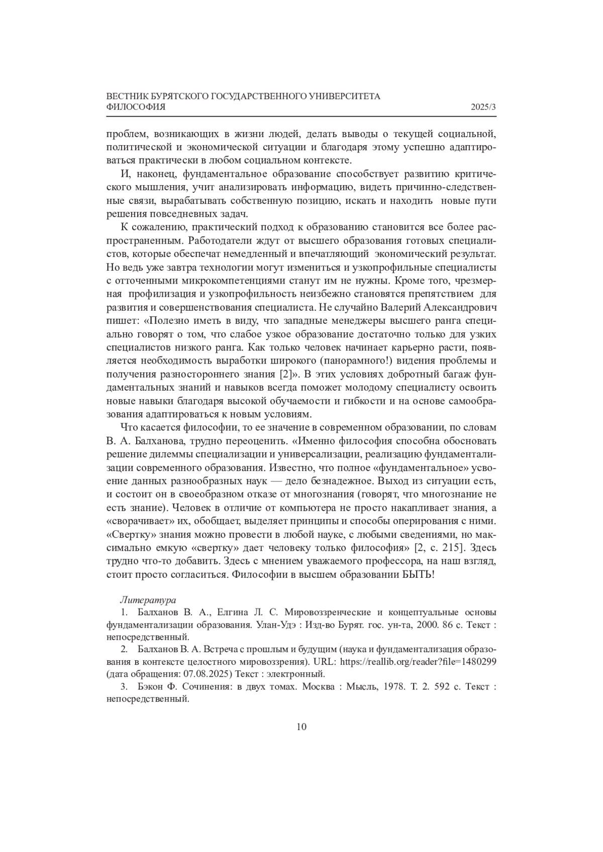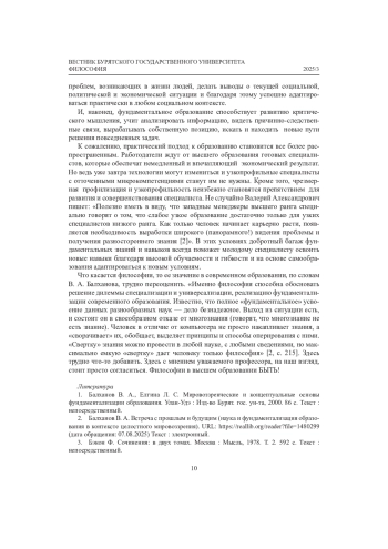 Статья: ФИЛОСОФИЯ В СОВРЕМЕННОЙ СИСТЕМЕ ОБРАЗОВАНИЯ: БЫТЬ ИЛИ НЕ БЫТЬ? (К 80-ЛЕТИЮ ДОКТОРА ФИЛОСОФСКИХ НАУК, ПРОФЕССОРА В. А. БАЛХАНОВА) (2025)