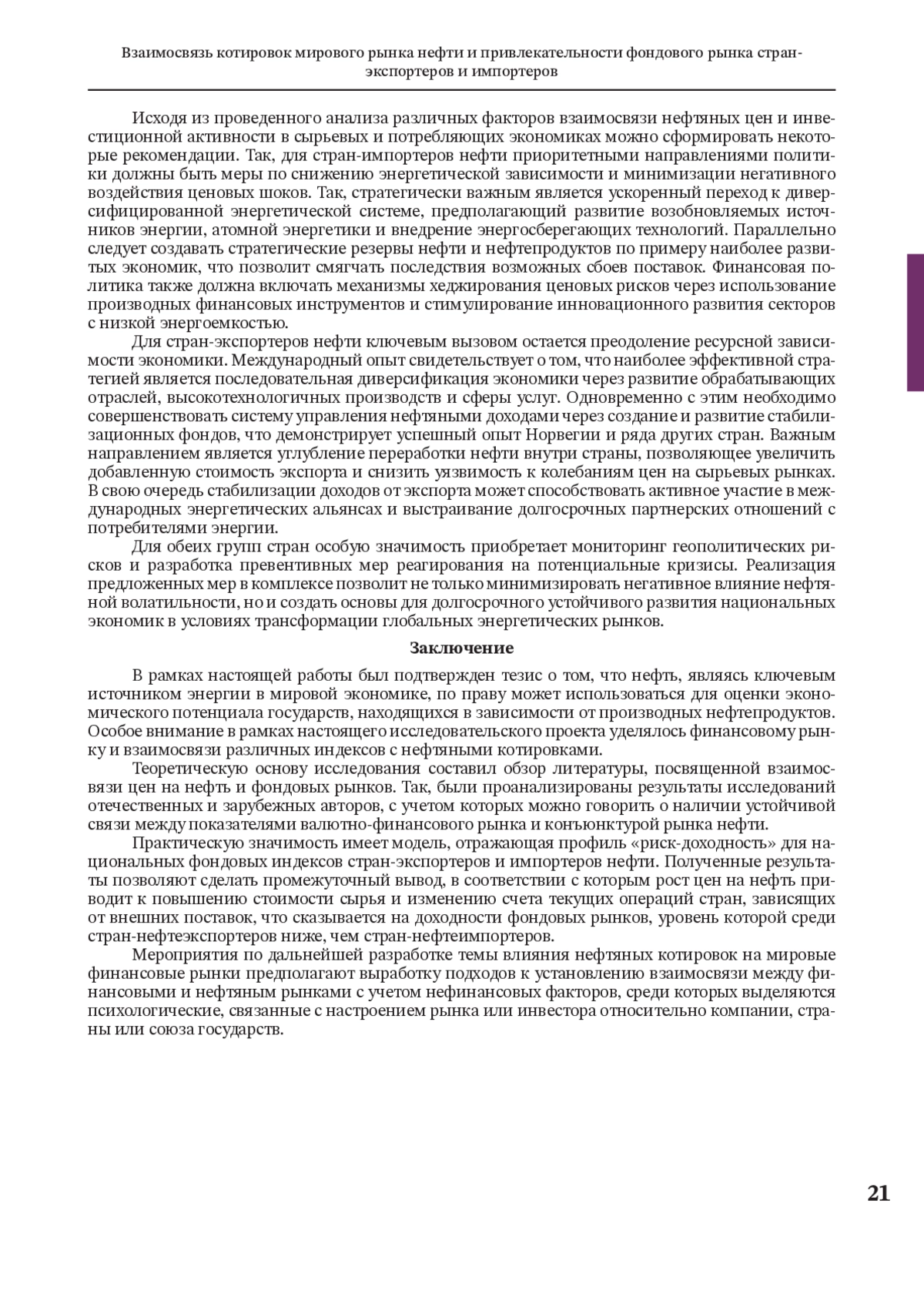Фондовый рынок является неотъемлемой частью экономики любого государства, поскольку экономический рост в значительной степени обуславливается непрерывной деятельностью участников рынка капитала, который играет ключевую роль в экономике страны благодаря развитию промышленности и торговли, а также росту национальный системы хозяйствования за счет мобилизации внутренних и иностранных сбережений для инвестиций в корпоративный сектор и финансирования государственных капитальных проектов. Ценные бумаги, являющиеся залогом ликвидности для инвесторов, также торгуются на фондовом рынке, а формирование их цены считается наблюдаемым показателем эффективности бизнеса и контроля за экономическим ростом. Следовательно, инструментом, активно используемым для выявления и отслеживания экономических тенденций, являются фондовые индексы: власти, центральные банки, промышленные предприятия и инвесторы уделяют пристальное внимание тому, как и почему именно изменяются сводные индексы, вычисляемые на основе цен определённой группы ценных бумаг. Поскольку финансовые системы большинства современных экономик полностью интегрированы с другими странами и используют технологические достижения, чтобы держать свои рынки открытыми для международных инвесторов, их развитие протекает под влиянием огромного множества факторов, среди которых выделяются нефтяные котировки. В этой связи особую актуальность представляет анализ влияния цены нефти на привлекательность фондового рынка стран-экспортеров и импортеров. Для достижения поставленной цели выполнены соответствующие задачи, а именно осуществлен обзор литературы на предмет сущности взаимосвязи нефтяных котировок и фондовых индексов, а также получены показатели риск-доходности для основных фондовых индексов стран импортеров и экспортеров нефти за период 2011 –2021 гг. Теоретическую основу исследования составили научные публикации, инструментами анализа которых стали общенаучные подходы к познанию. В свою очередь практические результаты подкреплены статистическими данными отраслевых агрегаторов, для обработки и оценки которых использовались методы статистического анализа.