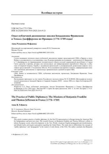 Статья посвящена изучению опыта публичной дипломатии первых представителей США в Европе в эпоху Войны за независимость и послевоенные годы. В центре внимания исследования – деятельность Б. Франклина и Т. Джефферсона по формированию положительного образа молодой американской республики в Старом Свете, средства и приемы, которые они использовали для информирования европейского общества о событиях в Северной Америке, борьбы с английской пропагандой и дезинформацией, развенчания мифов и негативных представлений о Соединенных Штатах. В исследовании предпринята попытка дифференциации понятий «публичная дипломатия» и «пропаганда» применительно к ранней истории США.