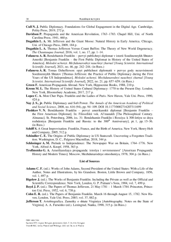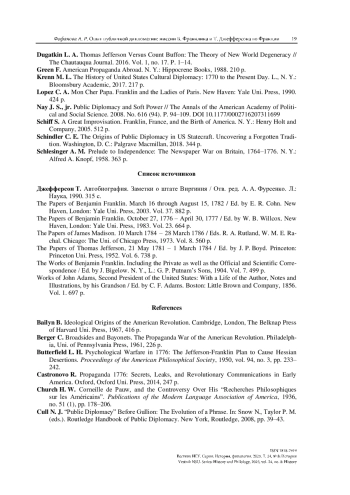4. Фофанова А. Р. Томас Джефферсон: опыт публичной дипломатии в первые годы независимости Соединенных Штатов // Молодой ученый. Международный научный журнал. 2022. № 21. С. 657-659.