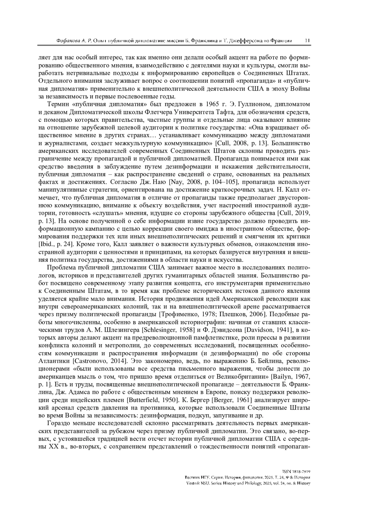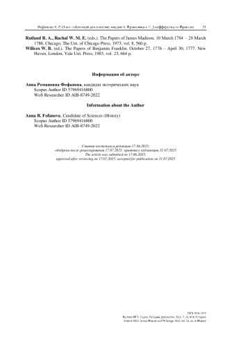 3. Фофанова А. Р. Бенджамин Франклин - первый публичный дипломат в истории Соединенных Штатов Америки // Молодой ученый. Международный научный журнал. 2021. № 46. С. 242-244.