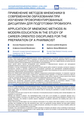 В эпоху стремительного развития фармацевтической отрасли, информационных технологий, провизор оказывается в такой ситуации, когда необходимо запоминать и применять на практике очень большой объем информации. Метод мнемоники образовался еще в древнем Египте. На сегодняшний день, метод мнемоники, может быть, эффективными инструментами для улучшения усвоения сложной информации и ее дальнейшего воспроизведения. Целью данной работы явилось исследование роли мнемоники в образовательном процессе для преподавания профориентированных дисциплин при подготовке провизора. Материалы и методы исследования. Методологической основой данной работы являются принципы системного подхода и комплексного анализа в изучении особенностей использования мнемоники для преподавания профориентированных дисциплин студентам специальности «Фармация». При выполнении работы были применены методы научного исследования, идеализации, формализации, абстрагирования и моделирования. Результаты. Мнемотехника обеспечивает более глубокое и продуктивное запоминание материала, что позволяет студентам более успешно усваивать новые знания и справляться с образовательными задачами, что позволяет значительно повысить абсолютную и качественную успеваемость. Представляя материал в виде таблиц и картинок, согласно результатам опроса студентов, хорошими цветами для зрительного восприятия информации являются желтый, голубой. Вывод. Таким образом, внедрение мнемотехники в современное образование является необходимым и актуальным, поскольку она способствует повышению уровня успеваемости студентов, развитию их когнитивных навыков, а также формированию навыков самообучения и повышению их уверенности в собственных возможностях.