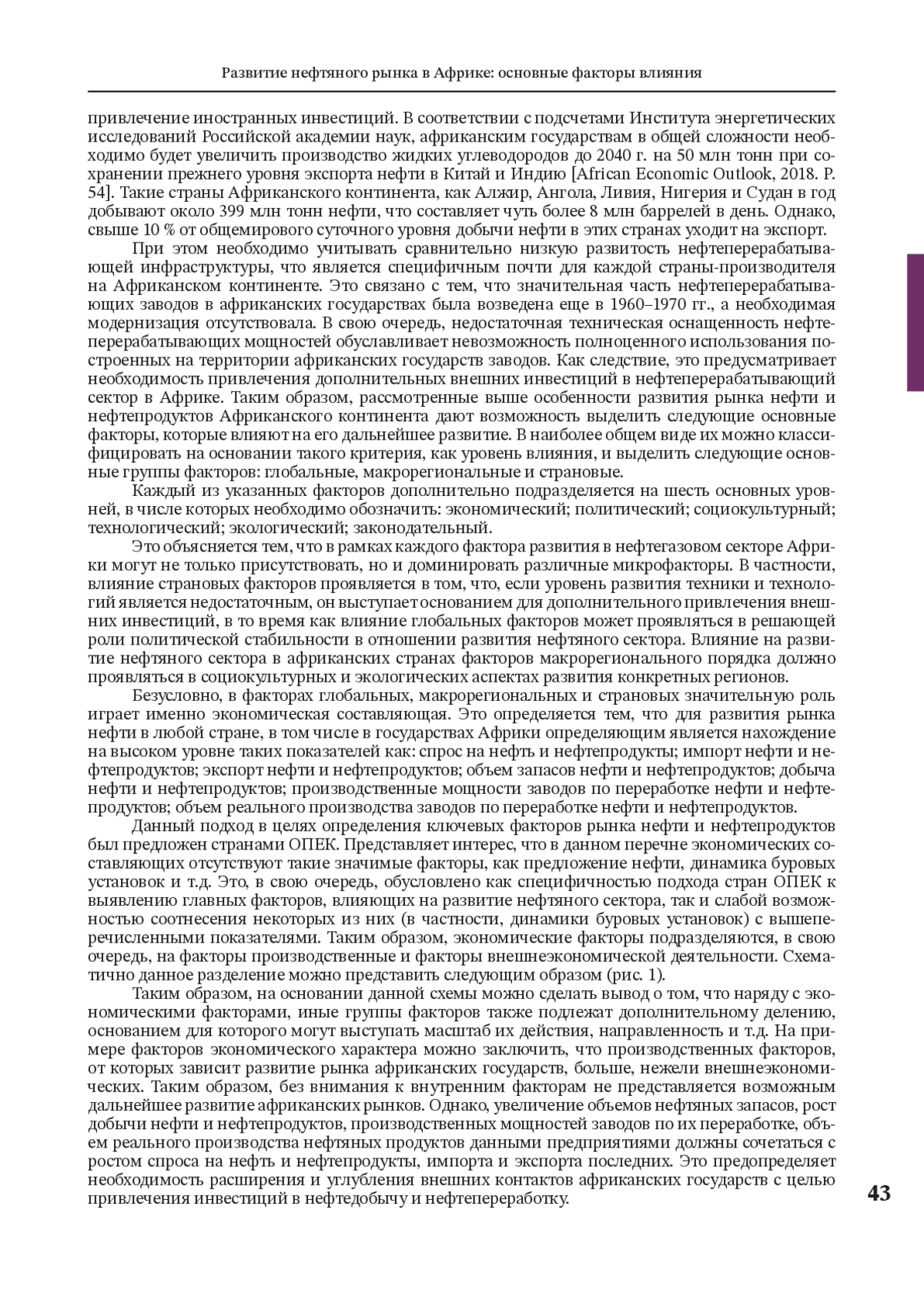 Исследование проблем развития нефтяного рынка в Африке представляет собой комплексную задачу, решение которой зависит как от оценки предшествующего уровня стран континента в области нефтедобычи и нефтепереработки, так и от текущего состояния, обозримых перспектив и трансформаций африканского нефтяного сектора. В этой связи, ключевую роль играет изучение факторов, оказывающих влияние на развитие нефтяного рынка в Африке. В настоящей статье автор определяет основные группы факторов, оказывающих воздействие на развитие нефтяного сектора африканских стран, выявляет основания для их классификации. В статье делается важный вывод о значимости экономических, политических, социокультурных и экологических факторов в рамках основных выделенных групп применительно к развитию нефтяного рынка в Африке.