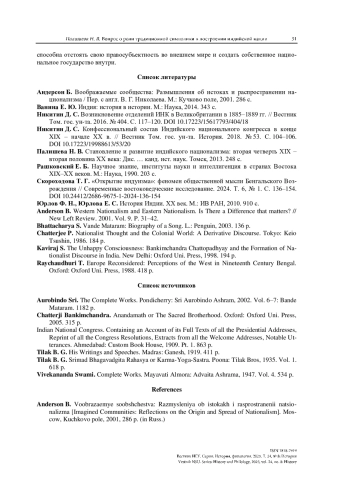 4. Никитин Д. С. Конфессиональный состав Индийского национального конгресса в конце XIX - начале XX в. // Вестник Том. гос. ун-та. История. 2018. № 53. С. 104-106. https://doi.org/10.17223/19988613/53/20