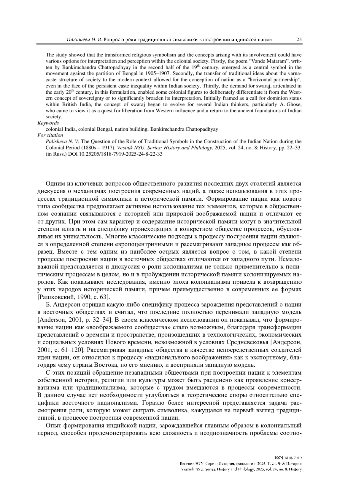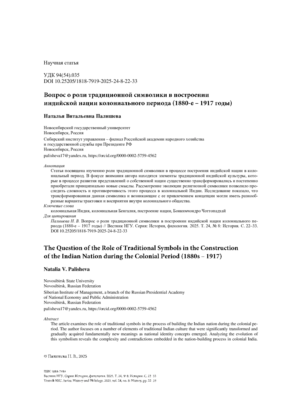 Статья посвящена изучению роли традиционной символики в процессе построения индийской нации в колониальный период. В фокусе внимания автора находятся элементы традиционной индийской культуры, которые в процессе развития представлений о собственной нации существенно трансформировались и постепенно приобретали принципиально новые смыслы. Рассмотрение эволюции религиозной символики позволило проследить сложность и противоречивость этого процесса в колониальной Индии. Исследование показало, что трансформированная данная символика и возникающие с ее привлечением концепции могли иметь разнообразные варианты трактовки и восприятия внутри колониального общества.