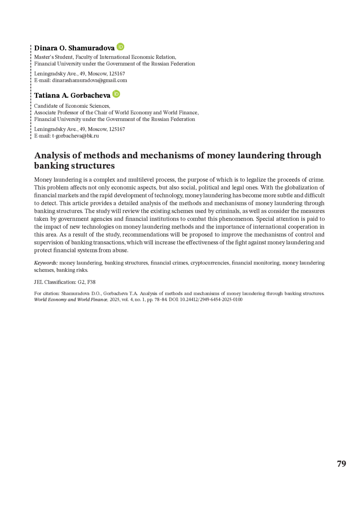 Статья посвящена актуальной проблеме отмывания денег через банковские структуры, представляющего собой сложный и многоуровневый процесс, целью которого является легализация доходов, полученных преступным путем. Данная проблема оказывает влияние не только на сферу экономики, но и социальную, политическую и правовую. Эта проблема затрагивает не только экономические аспекты, но и социальные, политические и правовые. Актуальность темы данного исследования обусловлена тем, что отмывание денег стало более тонким и трудным для выявления в условиях глобализации финансовых рынков и стремительного развития технологий. Анализ современной обстановки в сфере противодействия легализации преступных доходов и финансированию терроризма демонстрирует ключевую роль банковских организаций в этом направлении. Без активного участия банков результативная борьба с данными угрозами не представляется возможной, что потенциально способствует расширению теневого сектора экономики и росту числа сопутствующих преступлений. В статье проводится детальный анализ методов и механизмов отмывания денег через банковские структуры. Раскрыт сущностный цикл использования «грязных» денег в экономике. Проведен обзор существующих схем, используемых преступниками, а также рассмотрены меры, принимаемые государственными органами и финансовыми институтами для борьбы с этим явлением. Проанализированы статистические данные по отмыванию денег в России и мире. Особое внимание уделяется влиянию новых технологий на методы отмывания денег и важности международного сотрудничества в этой области. В результате исследования предложены рекомендации по улучшению механизмов контроля и надзора за банковскими операциями, что позволит повысить эффективность борьбы с отмыванием денег и защитить финансовые системы от злоупотреблений.