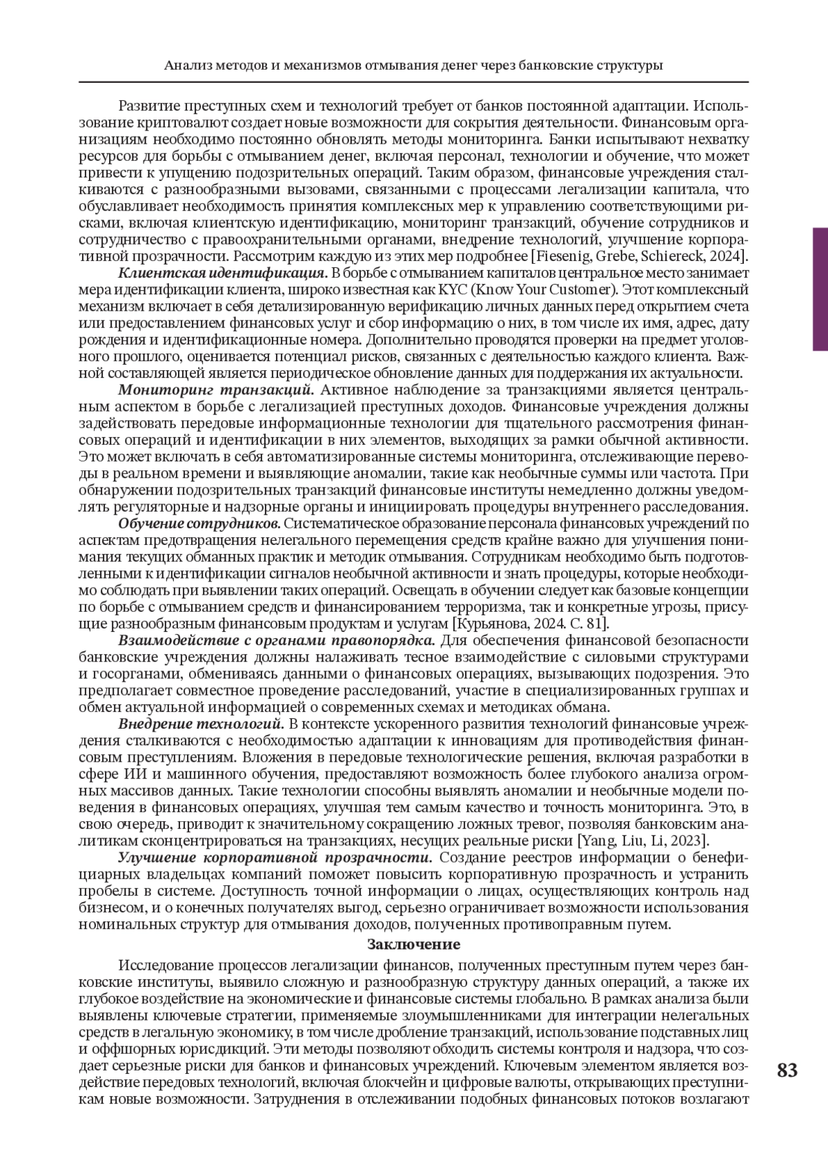 5. Курьянова И.В. Роль кредитных учреждений в борьбе с отмыванием денег и финансированием терроризма // Научный вестник: финансы, банки, инвестиции. 2024. № 2 (67). С. 78-88.