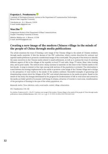 В статье рассматриваются способы формирования нового образа китайской деревни в сознании жителей Китая через материалы в СМИ. Перечисляются постановления властей КНР, в которых содержатся директивы для национальных и региональных медиаплощадок по продвижению модернизированного имиджа сельской местности. Целью исследования является определение основных нарративов в медиа Китая, связанных с малыми поселениями, а также анализ способов повествования о разных аспектах жизни в деревнях республики на местных ТВ и радио, в блогах, сериалах, фильмах, на видеохостингах, а также в печатных изданиях. Авторами отмечается резкий рост материалов по данной проблематике в китайских медиа в последнее десятилетие. Выявляется скачок интереса к данной теме среди широких слоёв населения. Отмечается взаимосвязь между реализуемой в СМИ стратегией по продвижению нового образа китайской деревни и сменой восприятия сельской действительности в сознании современной аудитории. Приводятся успешные примеры генерации и распространения контента о деревнях КНР и связанных с ними явлений в медиа. По итогам проведенного исследования перечисляются изменения, детерминированные программой по модернизации жизни в сельских районах и освещаемой в СМИ: рост экономического благосостояния граждан, привлечение туристов в сельские районы, трансформация восприятия фермерства в глазах городского населения и др.
