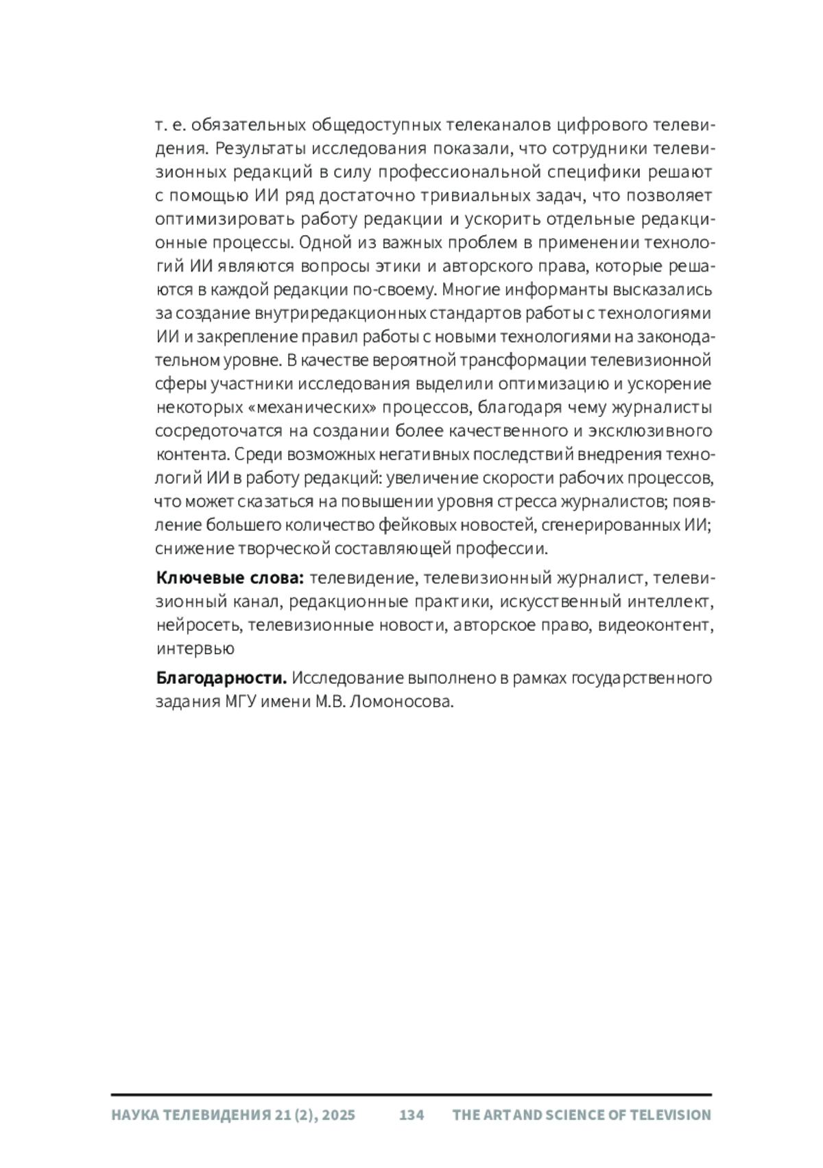 В статье изложены результаты эмпирических исследований практики использования технологий искусственного интеллекта (далее - ИИ) в российских телевизионных редакциях в двадцатых дискуссиях будущей телевизионной (шире - журналистской) профессии и ее трансформации в условиях развития новых технологий. Для работы было проведено 18 интервью с направлениями, входящими в состав первого и частично второго мультиплексов, т. е. е. обязательных общедоступных телеканалов телевидения. Результаты исследования показывают, что сотрудники телевизионных редакций в силе профессиональных специалистов решают с помощью ИИ ряд достаточно тривиальных задач, что позволяет оптимизировать работу редакции и ускорить процесс редактирования. Одной из важных проблем применения технологии ИИ являются вопросы этики и авторского права, которые решаются в каждой редакции по-своему. Многие информанты основаны на создании внутриредакционных стандартов работы с технологиями ИИ и закреплении правил работы с новыми технологиями на законодательном уровне. По мере вероятной трансформации телевизионных участников исследования отдельных направлений оптимизации и ускорения некоторых «механических» процессов, благодаря чему журналисты концентрируются на создании более качественного и эксклюзивного контента. Среди возможных негативных последствий развития технологий ИИ в работе редактирования: увеличение скорости рабочих процессов, что может сказаться на повышении уровня стресса журналистов; увеличение количества фейковых новостей, сгенерированных ИИ; здоровая творческая профессия.