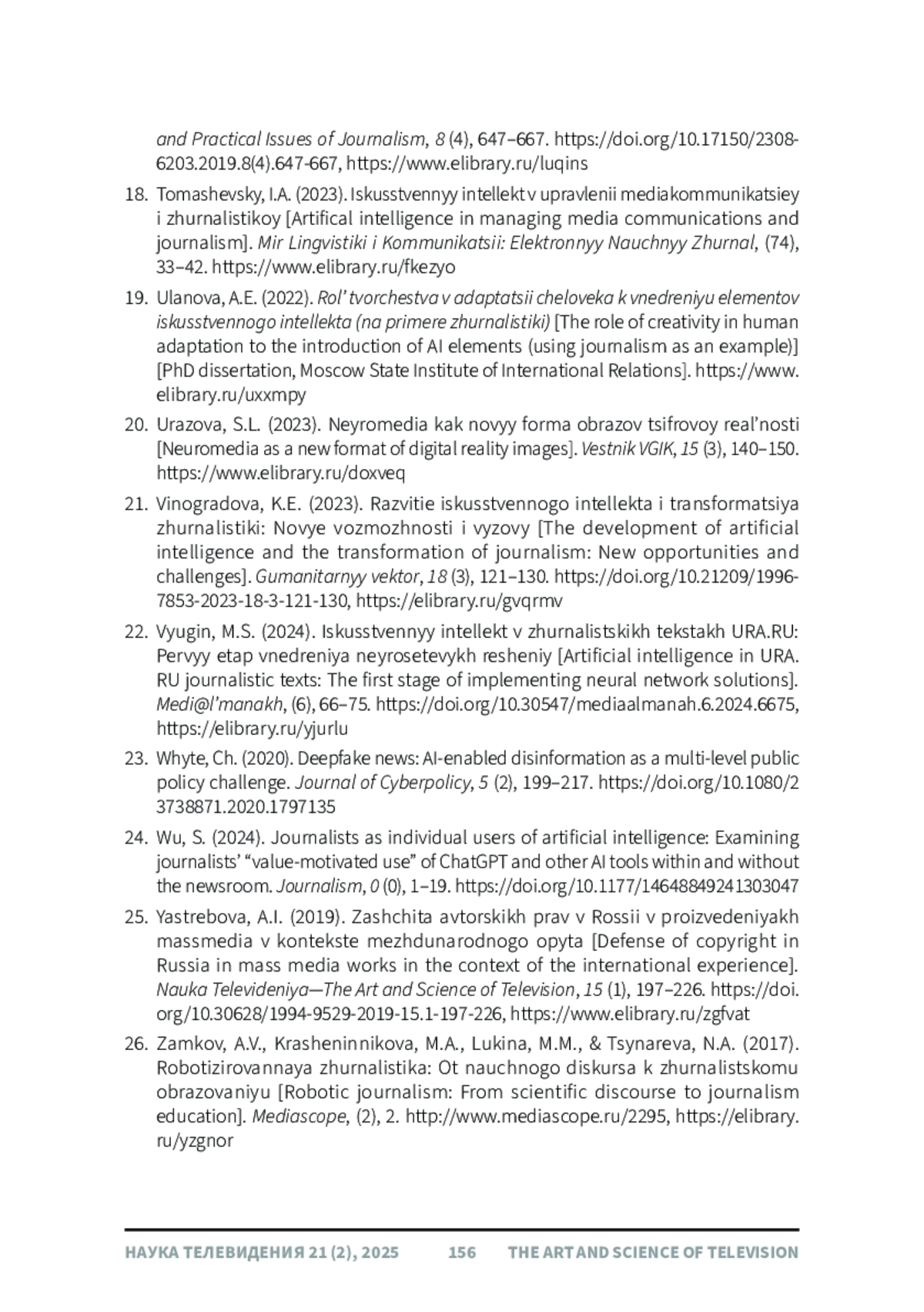 29. У, С. (2024). Журналисты как индивидуальные пользователи искусственного интеллекта: изучение «ценностно мотивированного» использования журналистами ChatGPT и других инструментов ИИ в редакции и за её пределами. Журналистика, 0 (0), 1-19. DOI: 10.1177/14648849241303047 EDN: ZSAATX