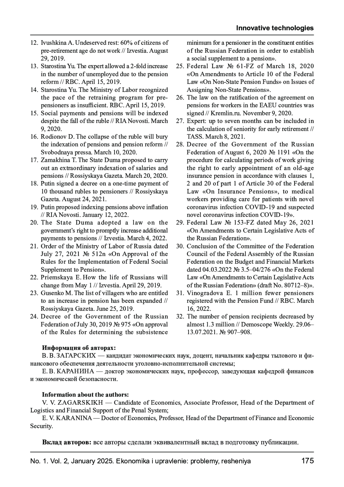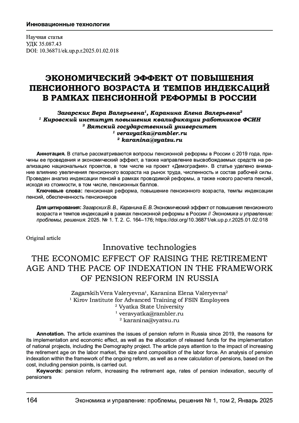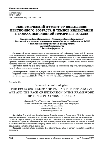 ЗАГАРСКИХ В. В., КАРАНИНА Е. В. ЭКОНОМИЧЕСКИЙ ЭФФЕКТ ОТ ПОВЫШЕНИЯ ПЕНСИОННОГО ВОЗРАСТА И ТЕМПОВ ИНДЕКСАЦИЙ В РАМКАХ ПЕНСИОННОЙ РЕФОРМЫ В РОССИИ // ЭКОНОМИКА И УПРАВЛЕНИЕ: ПРОБЛЕМЫ, РЕШЕНИЯ. 2025. ТОМ 2 № 1