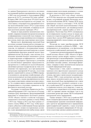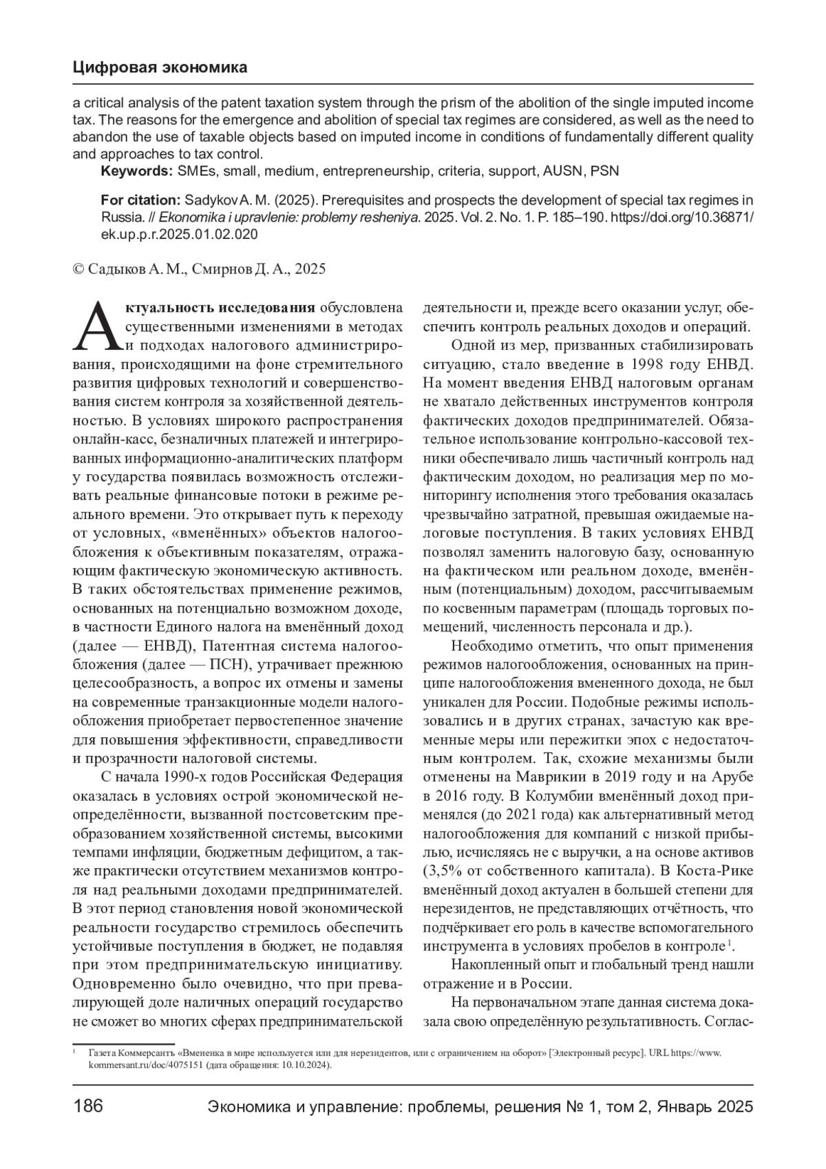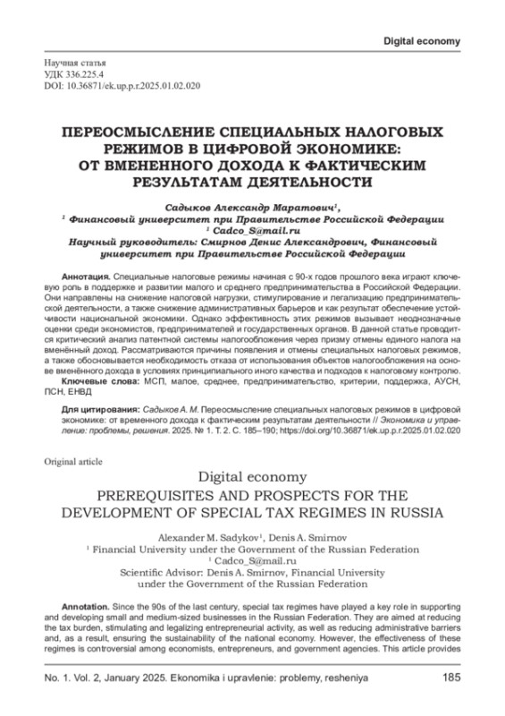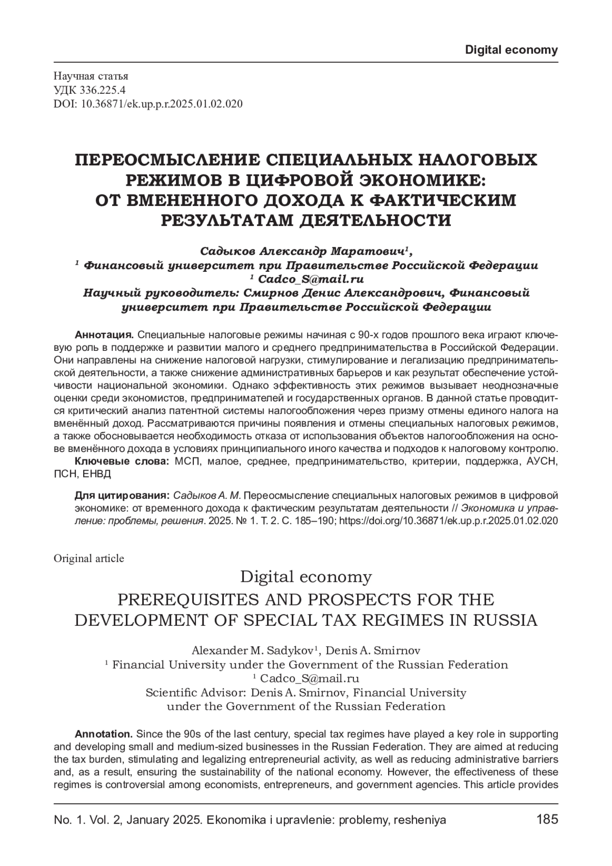Специальные налоговые режимы начиная с 90-х годов прошлого века играют ключевую роль в поддержке и развитии малого и среднего предпринимательства в Российской Федерации. Они направлены на снижение налоговой нагрузки, стимулирование и легализацию предпринимательской деятельности, а также снижение административных барьеров и как результат обеспечение устойчивости национальной экономики. Однако эффективность этих режимов вызывает неоднозначные оценки среди экономистов, предпринимателей и государственных органов. В данной статье проводится критический анализ патентной системы налогообложения через призму отмены единого налога на вменённый доход. Рассматриваются причины появления и отмены специальных налоговых режимов, а также обосновывается необходимость отказа от использования объектов налогообложения на основе вменённого дохода в условиях принципиального иного качества и подходов к налоговому контролю.