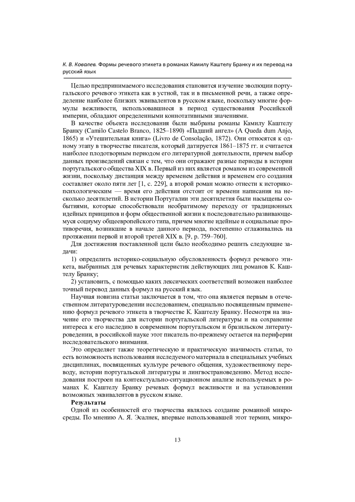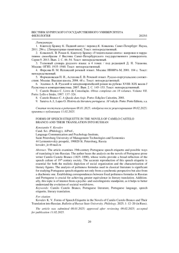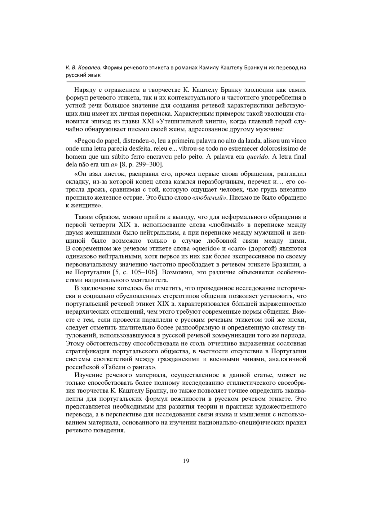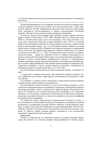 Предметом исследования становятся португальский речевой этикет XIX в. и возможные способы его перевода на русский язык. В своей статье автор опирается на романы португальского прозаика Камилу Каштелу Бранку (1825-1890), в чьем творчестве широкое отражение нашла принятая в XIX в. культура речевого общения, воспроизведение которой важно как для правдоподобного изображения социальной организации общества, так и для создания речевой характеристики действующих лиц. Анализ используемых в классической литературе формул вежливости имеет значение для изучения речевого этикета португальском языках не только в синхроническом, но и в диахроническом аспекте. Установление соответствий между устойчивыми формулами вежливости в русском и португальском языках важно для большей эквивалентности художественного перевода, а также может представлять интерес с точки зрения психо-и социолингвистики, поскольку позволяет лучше изучить эволюцию мировосприятия общества.
