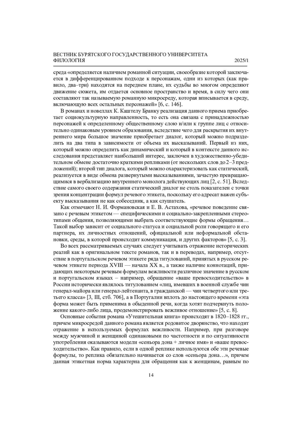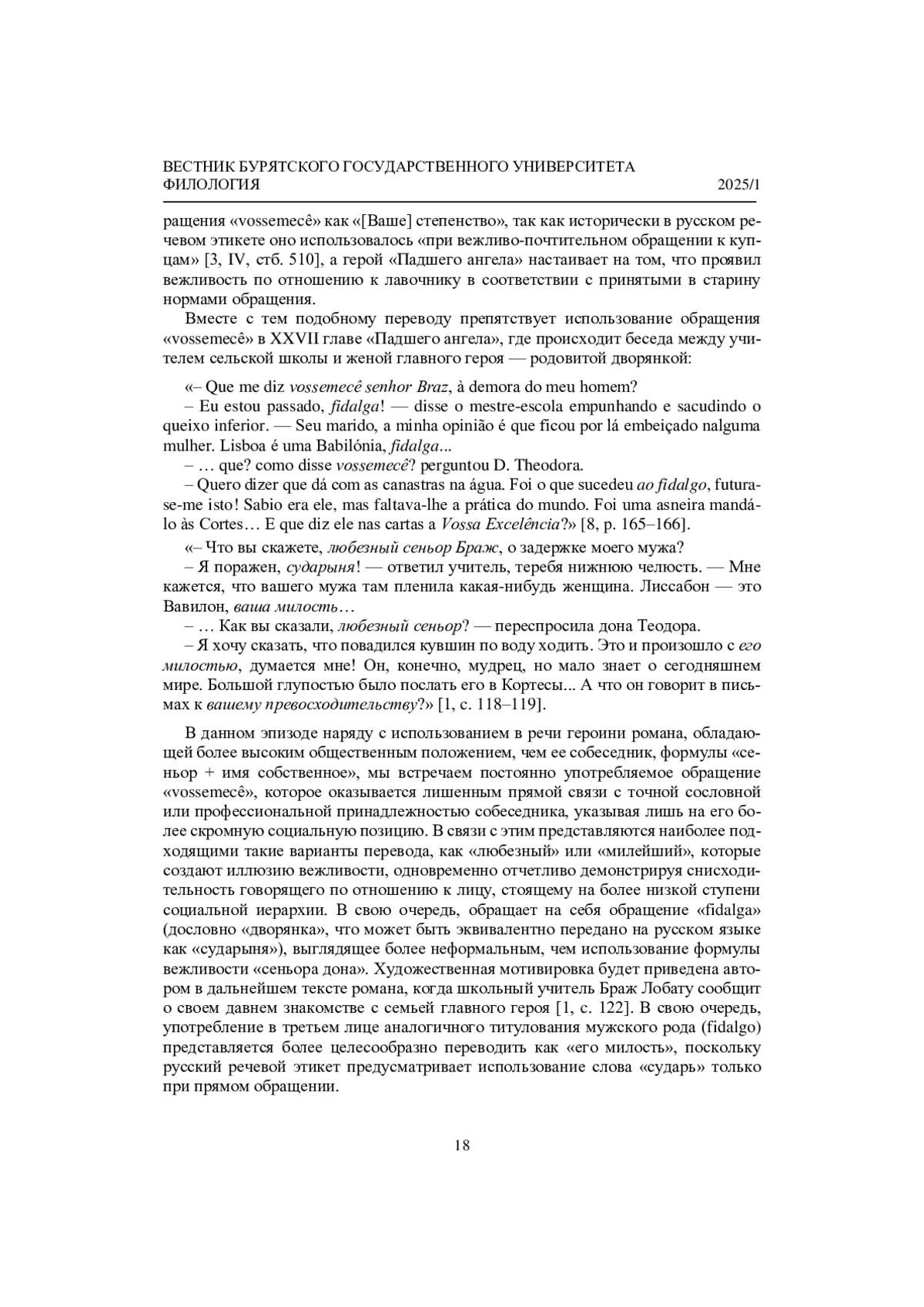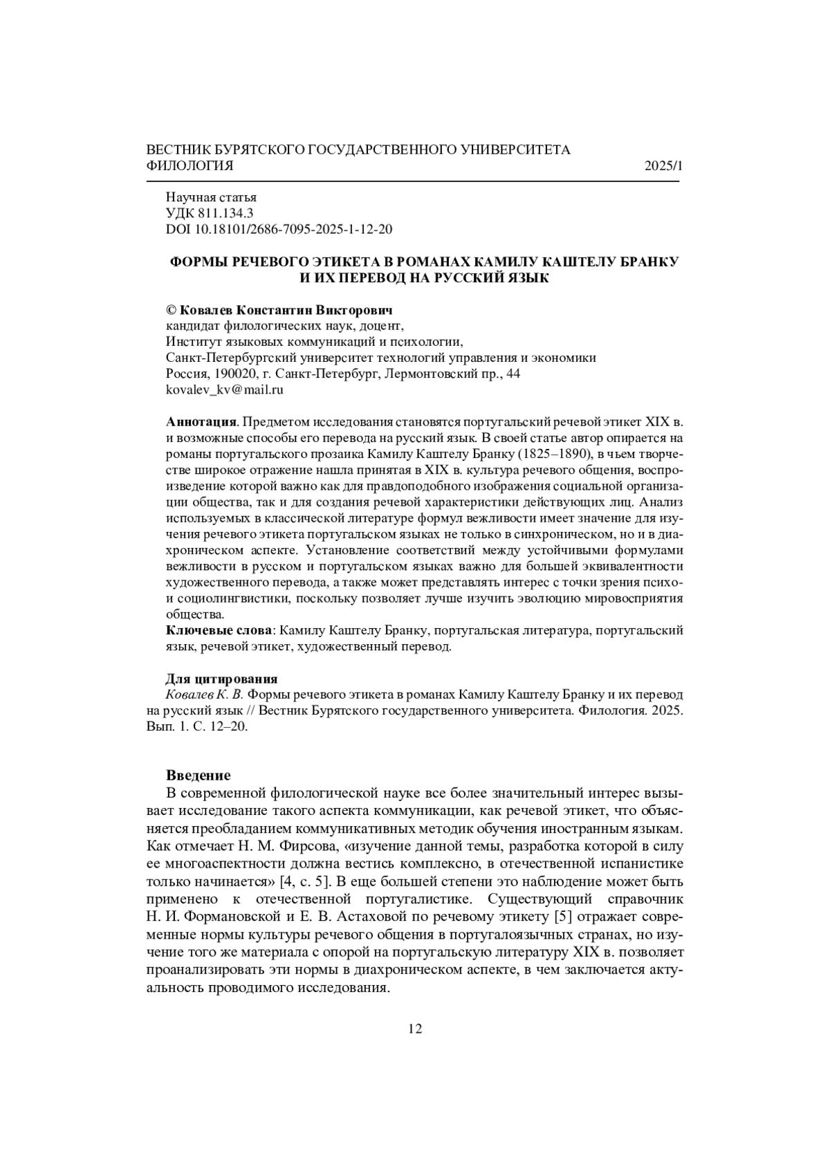 Предметом исследования становятся португальский речевой этикет XIX в. и возможные способы его перевода на русский язык. В своей статье автор опирается на романы португальского прозаика Камилу Каштелу Бранку (1825-1890), в чьем творчестве широкое отражение нашла принятая в XIX в. культура речевого общения, воспроизведение которой важно как для правдоподобного изображения социальной организации общества, так и для создания речевой характеристики действующих лиц. Анализ используемых в классической литературе формул вежливости имеет значение для изучения речевого этикета португальском языках не только в синхроническом, но и в диахроническом аспекте. Установление соответствий между устойчивыми формулами вежливости в русском и португальском языках важно для большей эквивалентности художественного перевода, а также может представлять интерес с точки зрения психо-и социолингвистики, поскольку позволяет лучше изучить эволюцию мировосприятия общества.