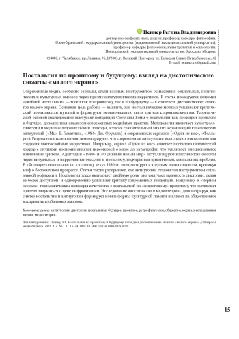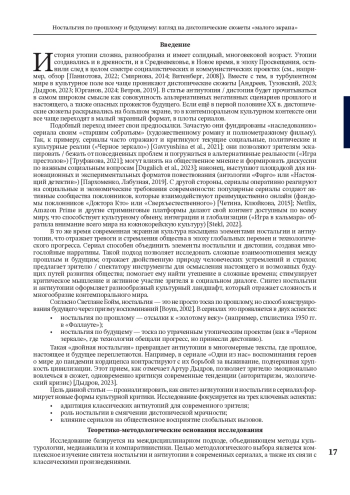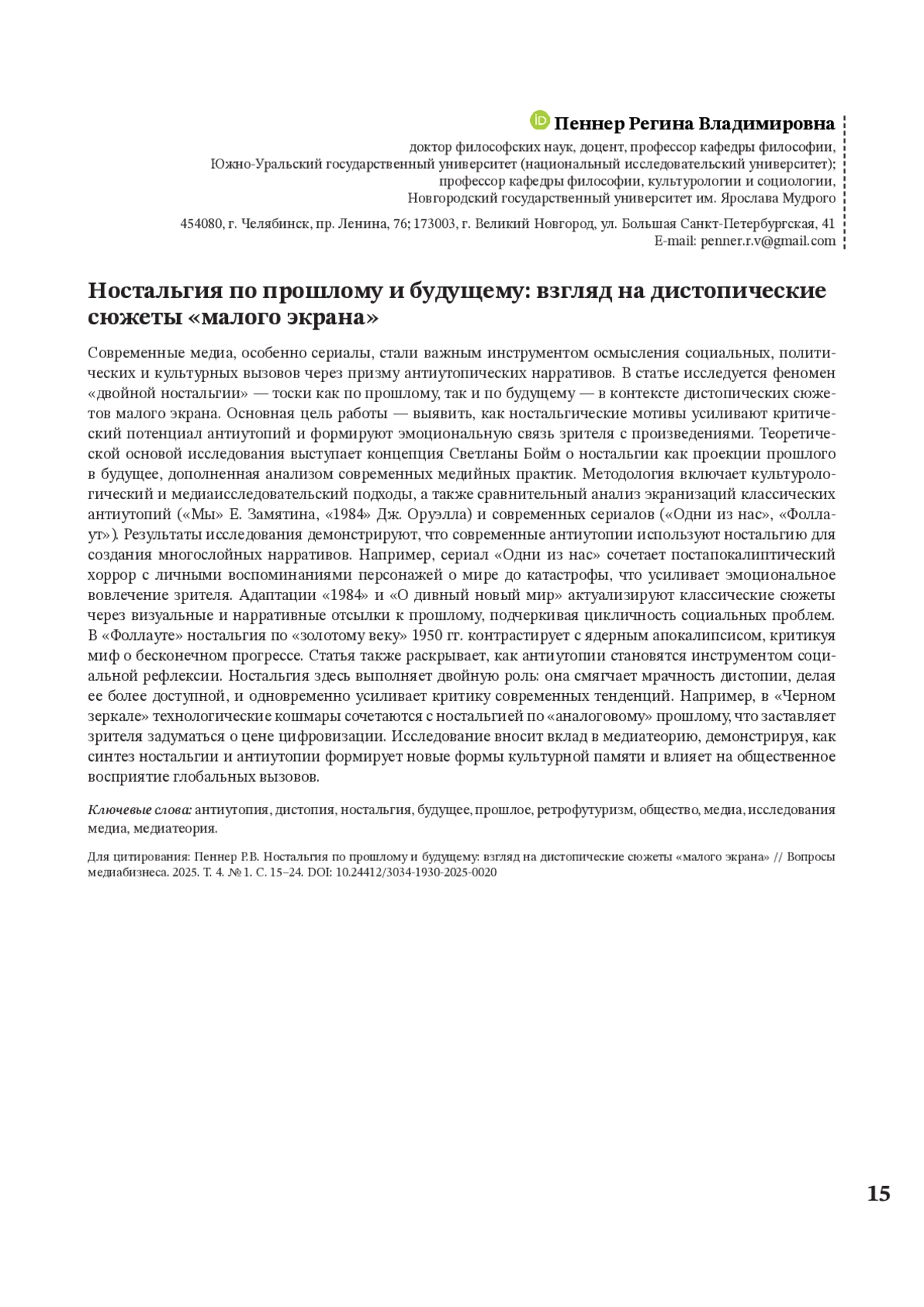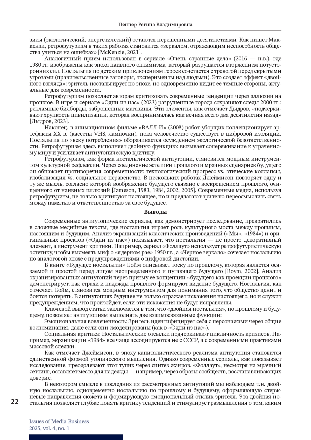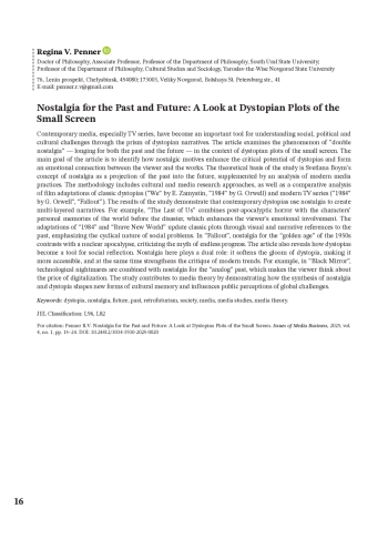 Современные медиа, особенно сериалы, стали важным инструментом осмысления социальных, политических и культурных вызовов через призму антиутопических нарративов. В статье исследуется феномен «двойной ностальгии» — тоски как по прошлому, так и по будущему — в контексте дистопических сюжетов малого экрана. Основная цель работы — выявить, как ностальгические мотивы усиливают критический потенциал антиутопий и формируют эмоциональную связь зрителя с произведениями. Теоретической основой исследования выступает концепция Светланы Бойм о ностальгии как проекции прошлого в будущее, дополненная анализом современных медийных практик. Методология включает культурологический и медиаисследовательский подходы, а также сравнительный анализ экранизаций классических антиутопий («Мы» Е. Замятина, «1984» Дж. Оруэлла) и современных сериалов («Одни из нас», «Фоллаут»). Результаты исследования демонстрируют, что современные антиутопии используют ностальгию для создания многослойных нарративов. Например, сериал «Одни из нас» сочетает постапокалиптический хоррор с личными воспоминаниями персонажей о мире до катастрофы, что усиливает эмоциональное вовлечение зрителя. Адаптации «1984» и «О дивный новый мир» актуализируют классические сюжеты через визуальные и нарративные отсылки к прошлому, подчеркивая цикличность социальных проблем. В «Фоллауте» ностальгия по «золотому веку» 1950 гг. контрастирует с ядерным апокалипсисом, критикуя миф о бесконечном прогрессе. Статья также раскрывает, как антиутопии становятся инструментом социальной рефлексии. Ностальгия здесь выполняет двойную роль: она смягчает мрачность дистопии, делая ее более доступной, и одновременно усиливает критику современных тенденций. Например, в «Черном зеркале» технологические кошмары сочетаются с ностальгией по «аналоговому» прошлому, что заставляет зрителя задуматься о цене цифровизации. Исследование вносит вклад в медиатеорию, демонстрируя, как синтез ностальгии и антиутопии формирует новые формы культурной памяти и влияет на общественное восприятие глобальных вызовов.