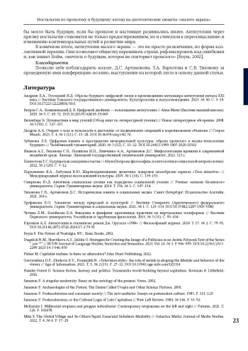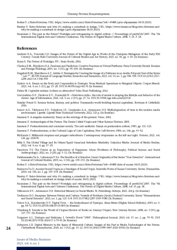 1. Андреев Е.А., Тузовский И.Д. Образы будущего цифровой эпохи в произведениях метажанра антиутопии начала XXI века // Вестник Томского государственного университета. Культурология и искусствоведение. 2023. № 50. С. 5-19. DOI: 10.17223/22220836/50/1