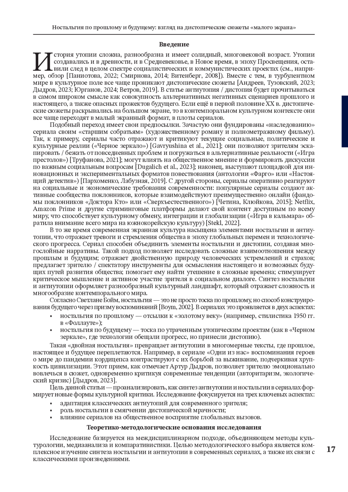 История утопии сложна, разнообразна и имеет солидный, многовековой возраст. Утопии создавались и в древности, и в Средневековье, в Новое время, в эпоху Просвещения, оставили след в целом спектре социалистических и коммунистических проектах (см., например, обзор [Паниотова, 2022; Смирнова, 2014; Витенберг, 2008]). Вместе с тем, в турбулентном мире в культурное поле все чаще проникают дистопические сюжеты [Андреев, Тузовский, 2023; Дыдров, 2023; Юрганов, 2024; Ветров, 2019]. В статье антиутопия / дистопия будет прочитываться в самом широком смысле как совокупность альтернативных негативных сценариев прошлого и настоящего, а также опасных прожектов будущего. Если ещё в первой половине XX в. дистопические сюжеты раскрывались на большом экране, то в контемпоральном культурном контексте они все чаще переходят в малый экранный формат, в плоты сериалов.