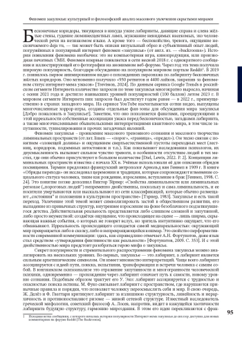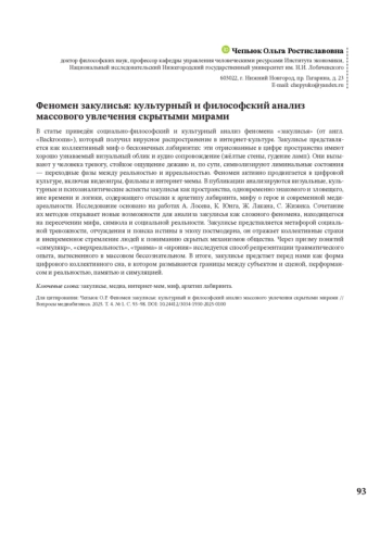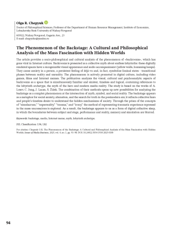 В статье приведён социально-философский и культурный анализ феномена «закулисья» (от англ. «Backrooms»), который получил вирусное распространение в интернет-культуре. Закулисье представляется как коллективный миф о бесконечных лабиринтах: эти отрисованные в цифре пространства имеют хорошо узнаваемый визуальный облик и аудио сопровождение (жёлтые стены, гудение ламп). Они вызывают у человека тревогу, стойкое ощущение дежавю и, по сути, символизируют лиминальные состояния — переходные фазы между реальностью и ирреальностью. Феномен активно продвигается в цифровой культуре, включая видеоигры, фильмы и интернет-мемы. В публикации анализируются визуальные, культурные и психоаналитические аспекты закулисья как пространства, одновременно знакомого и зловещего, вне времени и логики, содержащего отсылки к архетипу лабиринта, мифу о герое и современной медиареальности. Исследование основано на работах А. Лосева, К. Юнга, Ж. Лакана, С. Жижека. Сочетание их методов открывает новые возможности для анализа закулисья как сложного феномена, находящегося на пересечении мифа, символа и социальной реальности. Закулисье представляется метафорой социальной тревожности, отчуждения и поиска истины в эпоху постмодерна, он отражает коллективные страхи и вневременное стремление людей к пониманию скрытых механизмов общества. Через призму понятий «симулякр», «сверхреальность», «травма» и «ирония» исследуется способ репрезентации травматического опыта, вытесненного в массовом бессознательном. В итоге, закулисье предстает перед нами как форма цифрового коллективного сна, в котором размываются границы между субъектом и сценой, перформансом и реальностью, памятью и симуляцией.