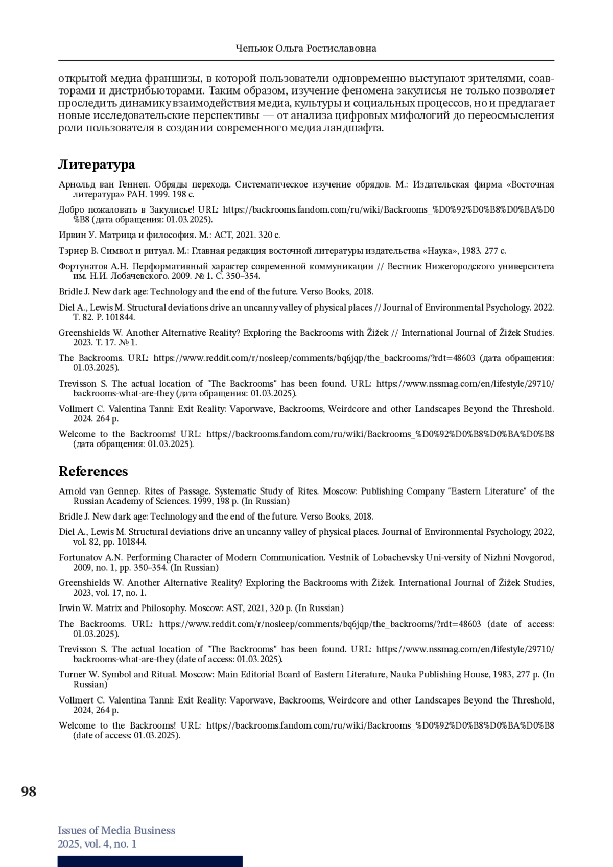 10. Trevisson S. The actual location of “The Backrooms” has been found. URL: https://www.nssmag.com/en/lifestyle/29710/backrooms-what-are-they (дата обращения: 01.03.2025).