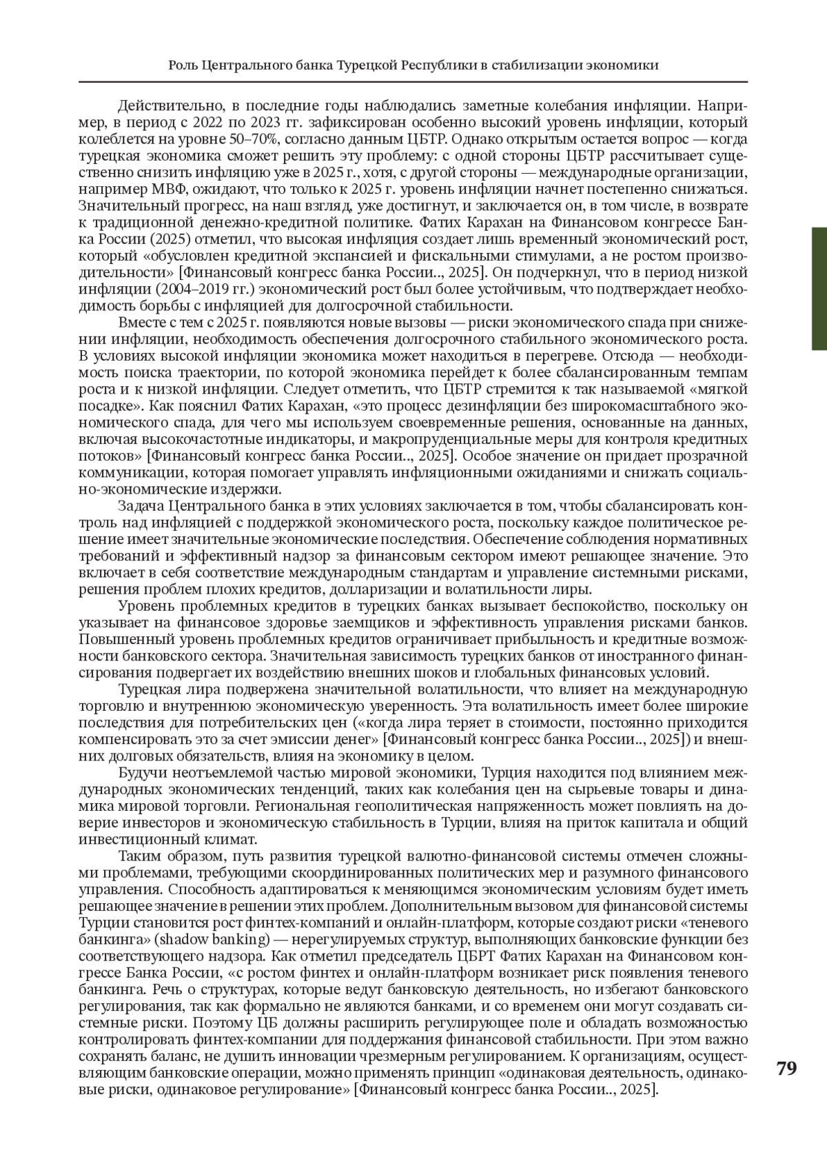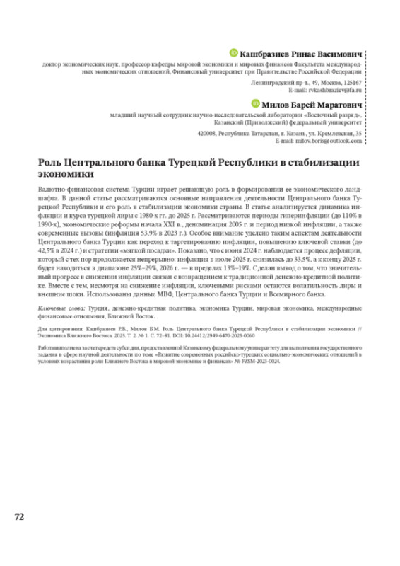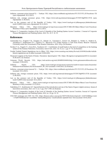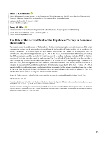 Валютно-финансовая система Турции играет решающую роль в формировании ее экономического ландшафта. В данной статье рассматриваются основные направления деятельности Центрального банка Турецкой Республики и его роль в стабилизации экономики страны. В статье анализируется динамика инфляции и курса турецкой лиры с 1980-х гг. до 2025 г. Рассматриваются периоды гиперинфляции (до 110% в 1990-х), экономические реформы начала XXI в., деноминация 2005 г. и период низкой инфляции, а также современные вызовы (инфляция 53,9% в 2023 г.). Особое внимание уделено таким аспектам деятельности Центрального банка Турции как переход к таргетированию инфляции, повышению ключевой ставки (до 42,5% в 2024 г.) и стратегии «мягкой посадки». Показано, что с июня 2024 г. наблюдается процесс дефляции, который с тех пор продолжается непрерывно: инфляция в июле 2025 г. снизилась до 33,5%, а к концу 2025 г. будет находиться в диапазоне 25%–29%, 2026 г. — в пределах 13%–19%. Сделан вывод о том, что значительный прогресс в снижении инфляции связан с возвращением к традиционной денежно-кредитной политике. Вместе с тем, несмотря на снижение инфляции, ключевыми рисками остаются волатильность лиры и внешние шоки. Использованы данные МВФ, Центрального банка Турции и Всемирного банка.