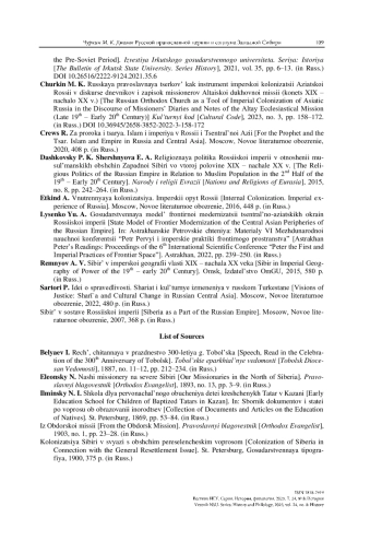 1. Балин М. А. Религиозная политика на восточных окраинах Российской империи: общественно-политический дискурс второй половины XIX - начала ХХ в. // Изв. Иркут. гос. унта. Серия: История. 2022. Т. 41. С. 31-40. https://doi.org/10.26516/2222-9124.2022.41.31