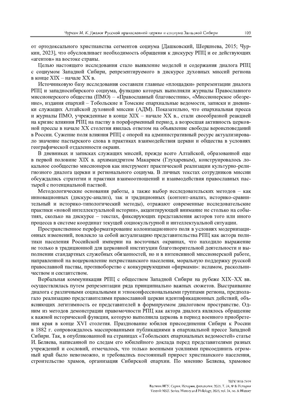 Статья посвящена выявлению моделей и содержания диалога РПЦ с социумом Западной Сибири, в репрезентациях дискурса духовных миссий региона в конце ХIХ – начале ХХ вв. В работе охарактеризованы «площадки» дискурса православной церкви, функцию которых выполняли церковные периодические издания и личные тексты служащих духовных миссий. Установлено, что в строительстве диалога с инородцами, раскольниками и сектантами, церковь восполняла дефицит государственного участия в колонизационном деле и культурной политике на восточных окраинах империи. В то же время, представители сообщества миссионеров, находясь в тесном контакте с населением слабо вовлеченных в систему имперского управления районов, отдавали себе отчет в том, что имперская линия «культурного выравнивания», осуществляемая средствами русификации коренных народов и преследования религиозных диссидентов, имеет малую эффективность.
