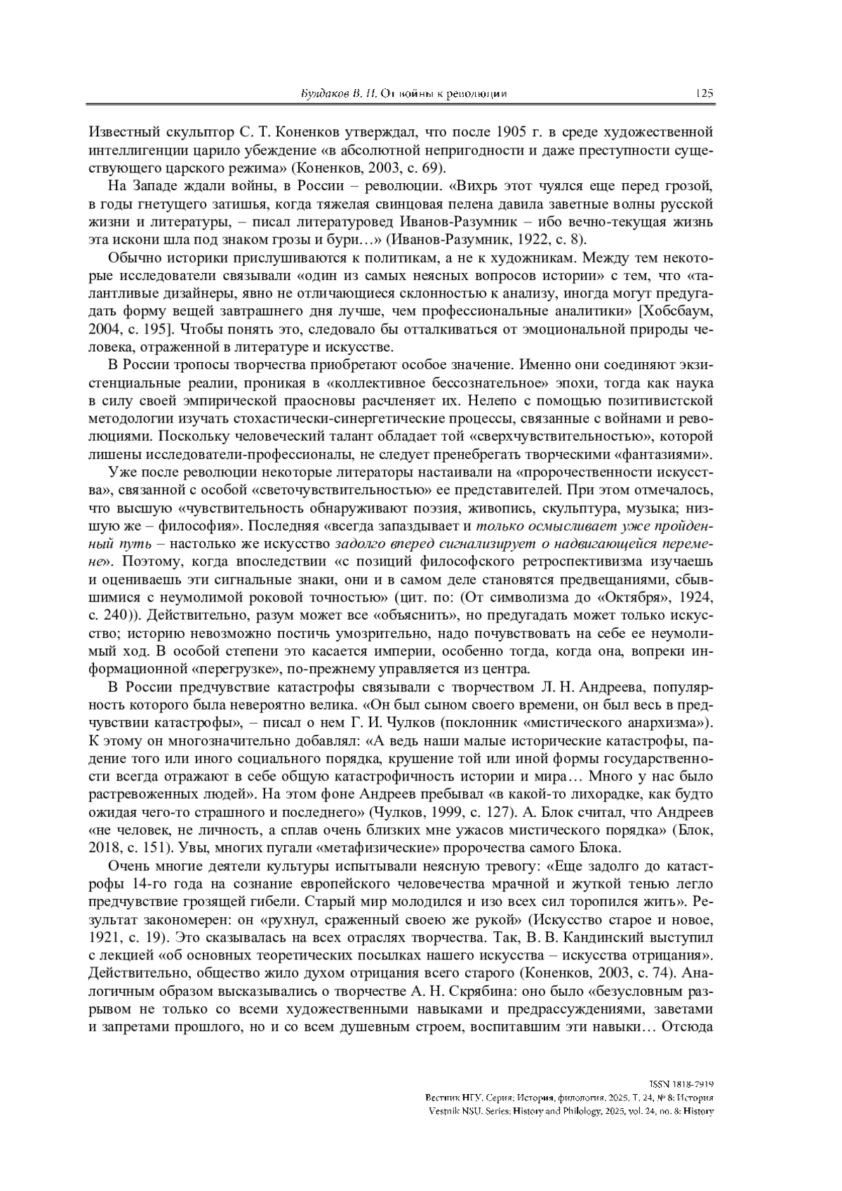 Автор доказывает, что для дальнейшего изучения предреволюционной ситуации в России необходима смена исследовательской парадигмы. При этом требуется качественное изменение и расширение источниковой базы за счет эго-документов, исходящих прежде всего от творческих элит. Исследователи до сих пор не обращали внимания на то, что предвоенное и предреволюционное время было насыщенно смутными ожиданиями, предсказаниями и прогнозами в их среде. Анализ соответствующих документов показывает, что российские культурные элиты пребывали в ожидании мировых и российских потрясений. Их страхи и ожидания постепенно стали резонировать с массовой психологией. Таким образом, предпосылки революции оказались связаны с деструктивной психологией, зародившейся задолго до нее. Соответственно ход дальнейших событий оказался неуправляемым.