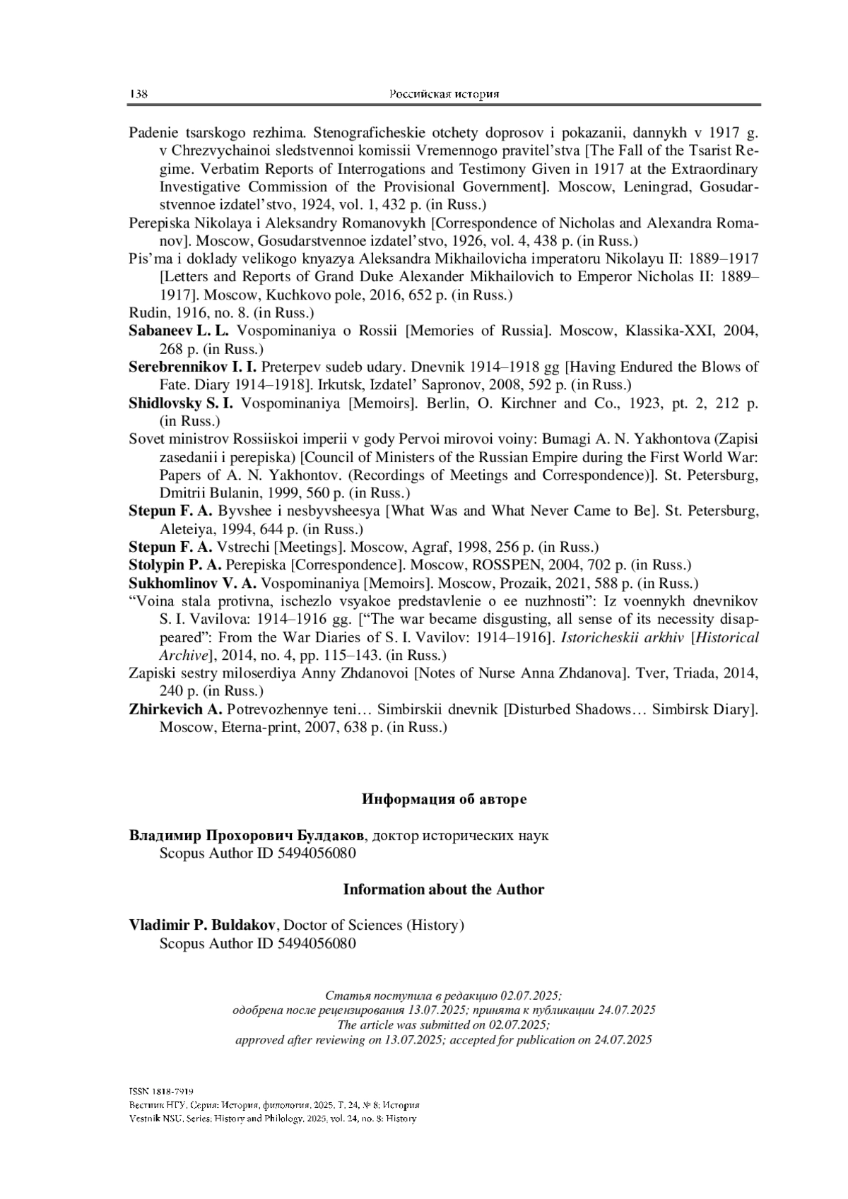 10. Россия в годы Первой мировой войны: Экономическое положение, социальные процессы, политический кризис / Отв. ред. Ю. А. Петров. М.: РОССПЭН, 2014. 982 с.