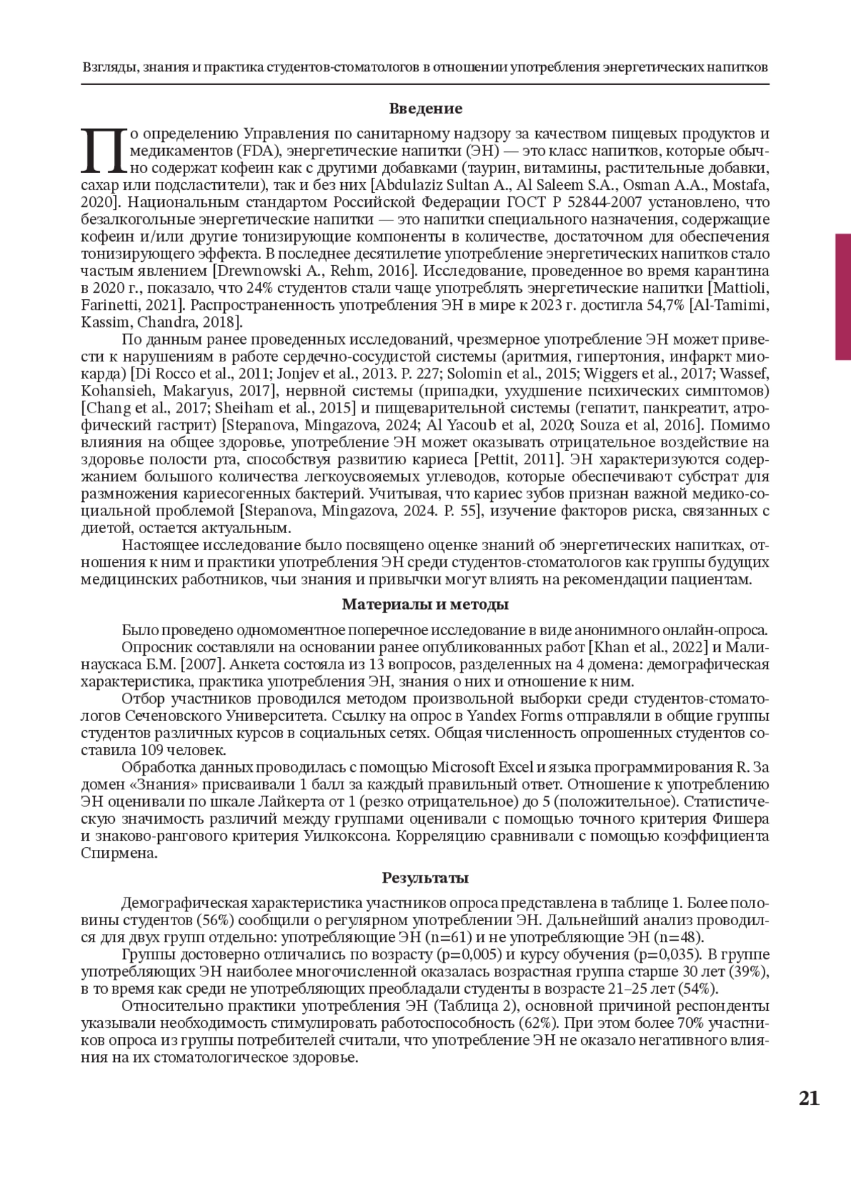 Статья: Взгляды, знания и практика студентов-стоматологов в отношении употребления энергетических напитков (2025)