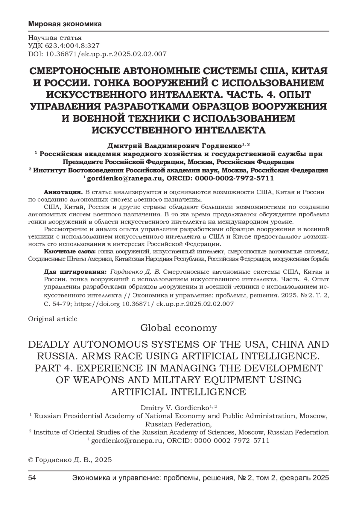 Рассмотрение и анализ опыта управления разработками образцов вооружения и военной техники с использованием искусственного интеллекта в США и Китае предоставляют возможность его использования в интересах Российской Федерации.