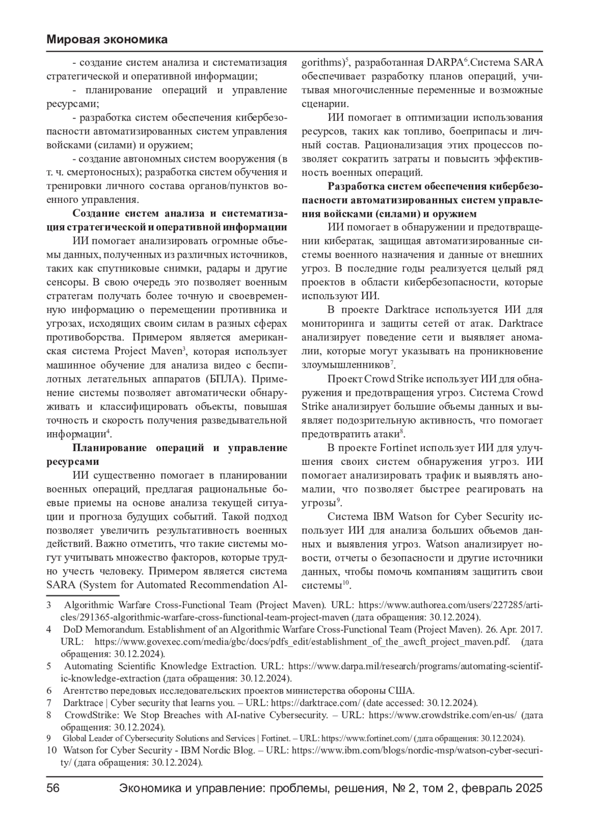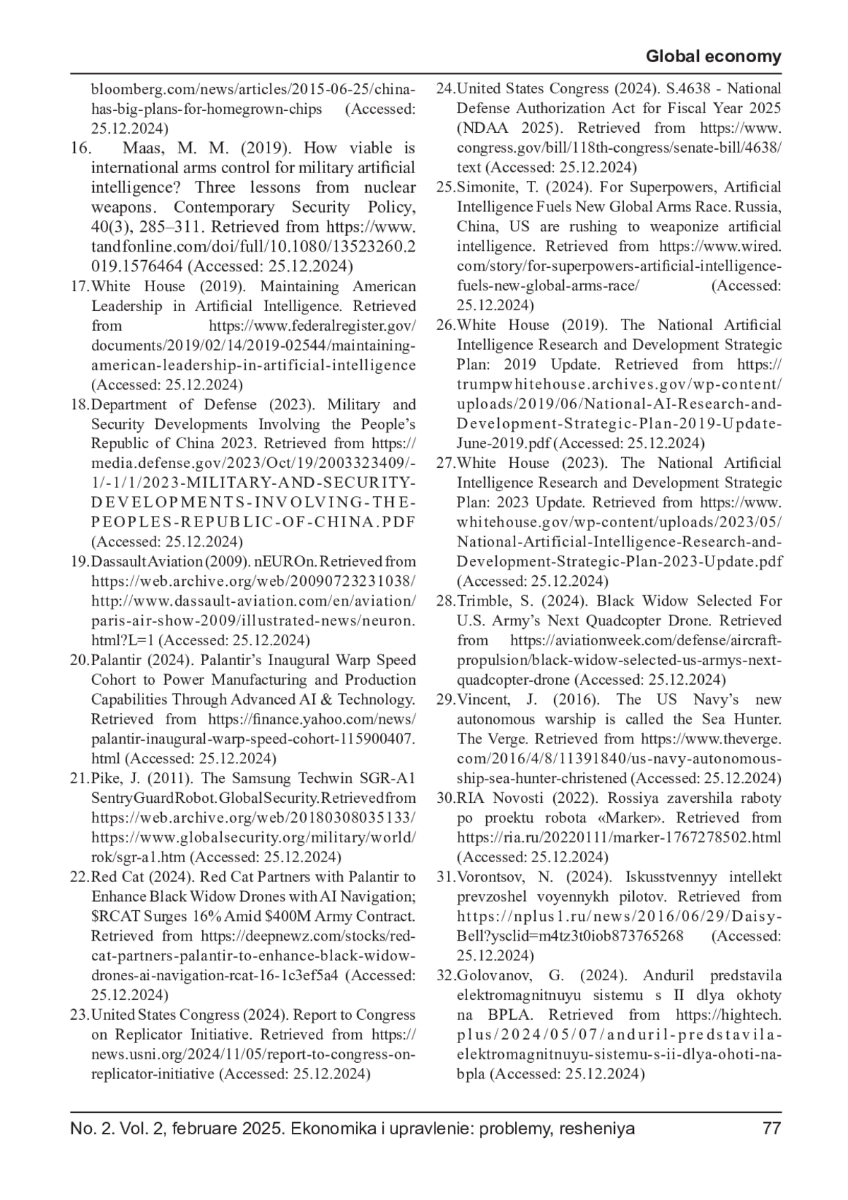 2. AI-wielding tech firms are giving a new shape to modern warfare [рус. Технологические компании, использующие искусственный интеллект, придают новую форму современной войне]. The Economis. Feb 16. 2023. URL: https://www.economist.com/business/2023/02/16/aiwielding-tech-firms-are-giving-a-new-shape-tomodern-warfare (дата обращения: 25.12.2024).