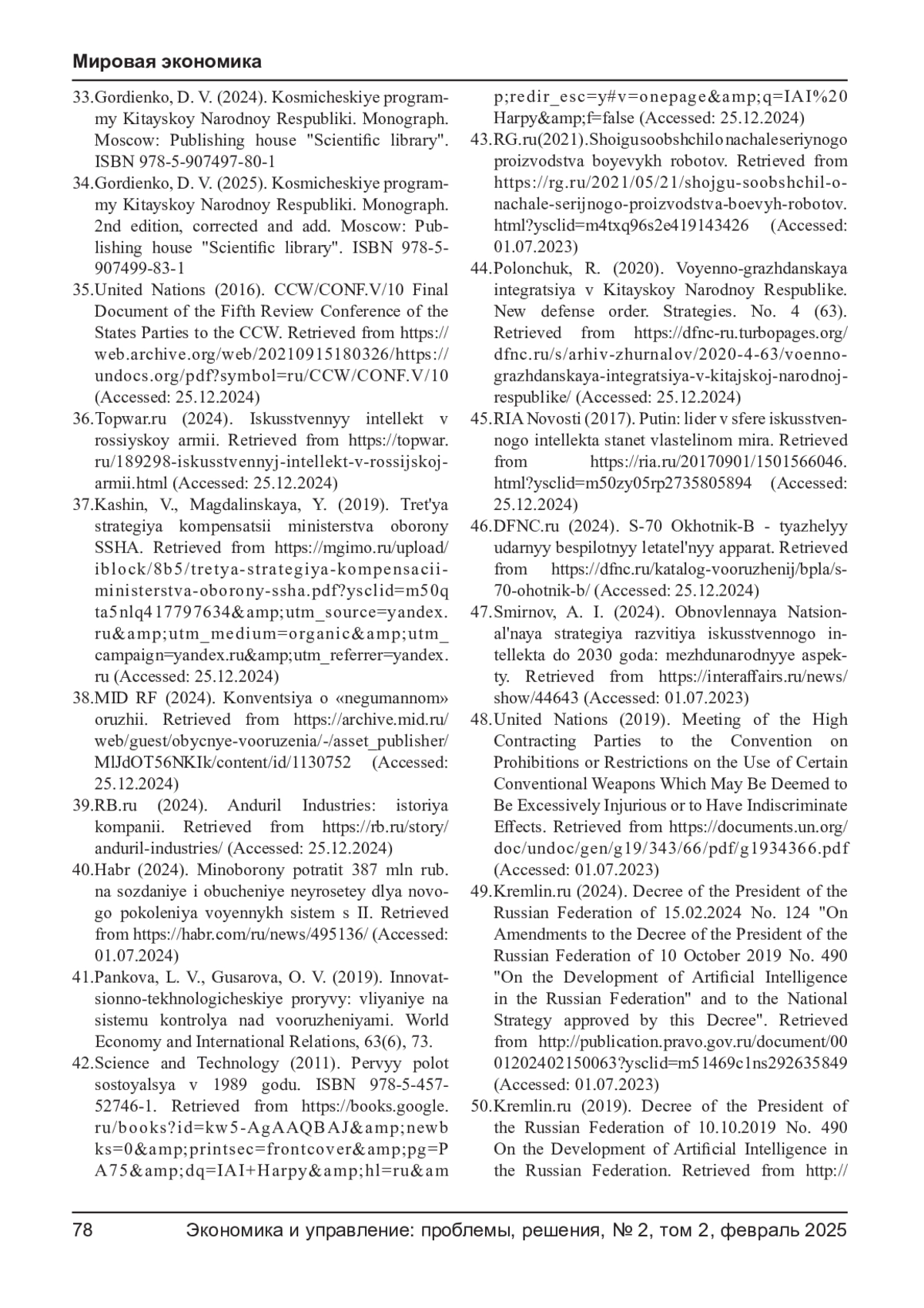 41. Панкова Л. В., Гусарова О. В. Иновационно-технологические прорывы: влияние на систему контроля над вооружениями // Мировая экономика и международные отношения. - 2019. - Т. 63, № 6. - С. 73. EDN: CULGBO