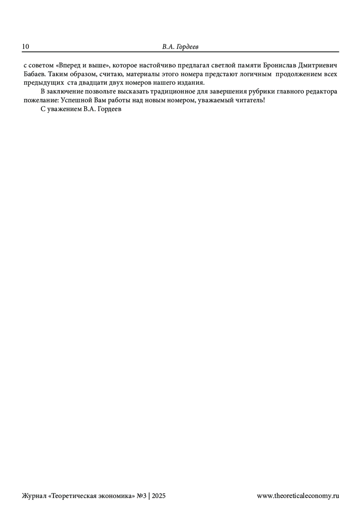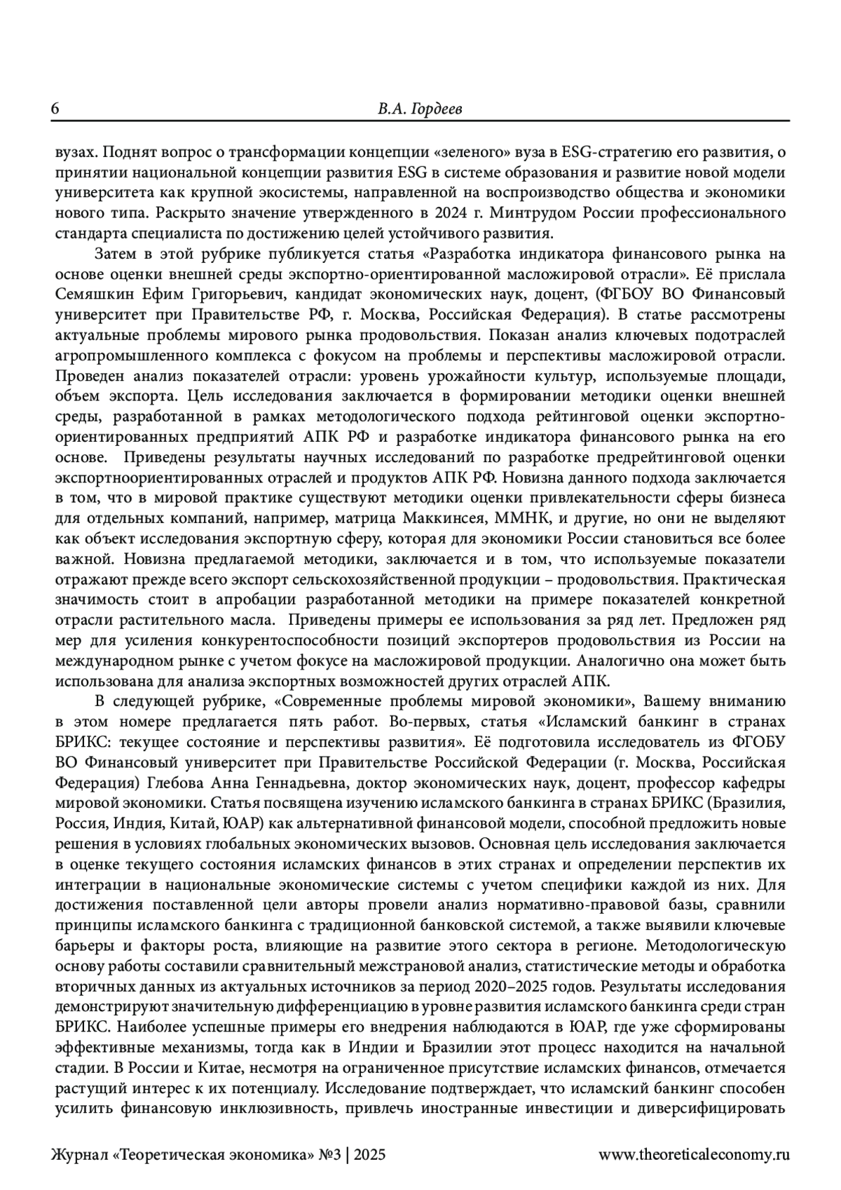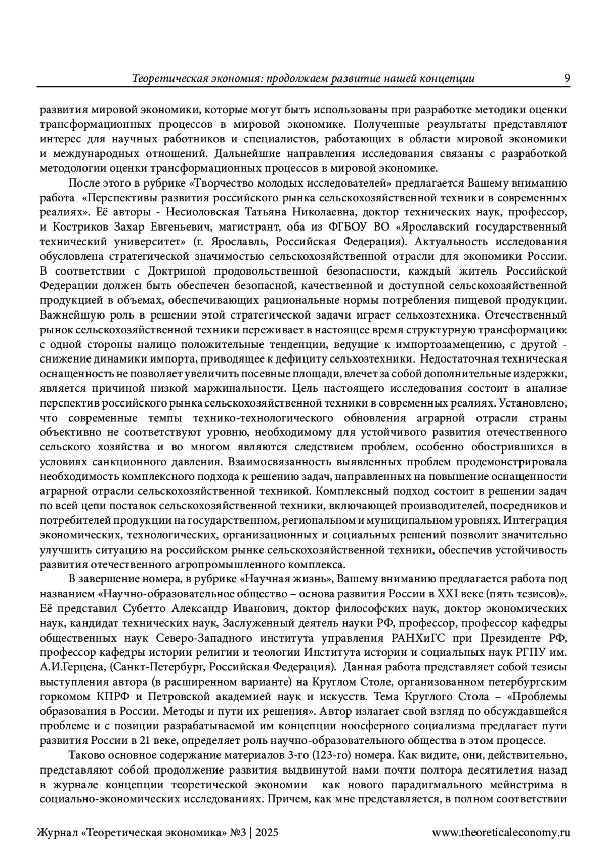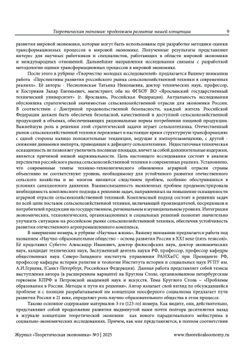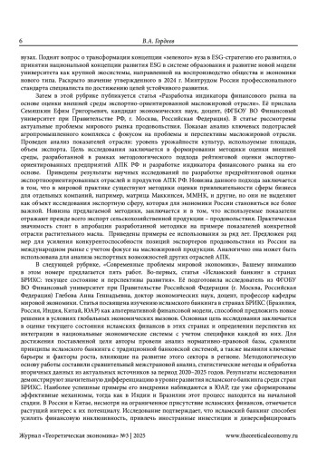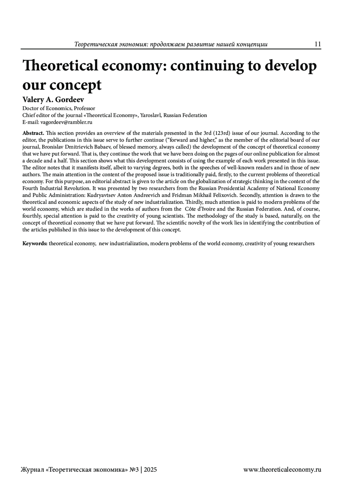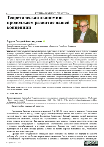 В этой рубрике дается обзор материалов, представленных в 3-м (123-м) номере нашего журнала. По мнению редактора, публикации данного номера служат дальнейшему продолжению («вперед и выше», как призывал всегда светлой памяти член редколлегии нашего журнала Бронислав Дмитриевич Бабаев) развития выдвинутой нами концепции теоретической экономии. То есть продолжают то дело, которое мы осуществляем на страницах нашего сетевого издания вот уже на протяжении почти полутора десятилетий. Показано в этой рубрике, в чем же это развитие заключается на примере каждой представленной в данном номере работы. Редактором отмечено, что оно проявляется, хотя и в неодинаковой степени, как в выступлениях и известных читателям, так и новых авторов. Главное внимание в содержании предлагаемого номера традиционно уделено, во-первых, актуальным проблемам теоретической экономии. С этой целью дана редакторская аннотация статьи о глобализации стратегического мышления в условиях Четвертой промышленной революции. Её представили двое исследователей из Российской академии народного хозяйства и государственно службы при Президенте Российской Федерации: Кудрявцев Антон Андреевич и Фридман Михаил Феликсович. Во-вторых, обращено внимание на теоретико-экономические аспекты исследования новой индустриализации. В-третьих, большое внимание уделено современным проблемам мировой экономики, которые исследуются в работах авторов из Кот-д’Ивуар и Российской Федерации. И, конечно, в-четвертых, особое внимание уделено творчеству молодых ученых. Методология исследования основана, естественно, на выдвинутой нами концепции теоретической экономии. Научная новизна работы заключается в выявлении вклада публикуемых в данном номере статей в развитие этой концепции.