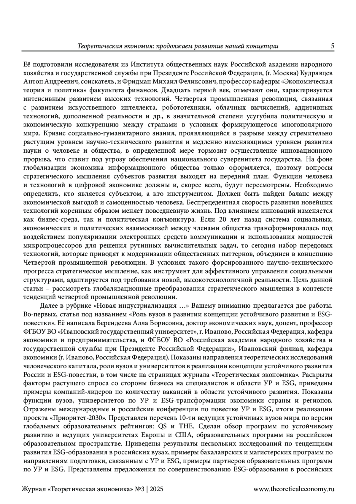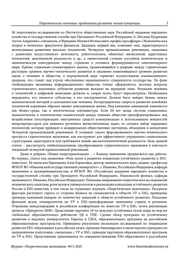 Показаны направления теоретических исследований человеческого капитала, роли вузов и университетов в реализации концепции устойчивого развития России и ESG-повестки, в том числе на страницах журнала «Теоретическая экономика». Раскрыты факторы растущего спроса со стороны бизнеса на специалистов в области УР и ESG, приведены примеры компаний-лидеров по количеству вакансий в области устойчивого развития. Показаны функции вузов, университетов по УР и ESG-трансформации экономики страны и регионов. Отражены международные и российские конференции по повестке УР и ESG, итоги реализации проекта «Приоритет-2030». Представлен перечень 10-ти ведущих устойчивых вузов мира по версии глобальных образовательных рейтингов: QS и THE. Сделан обзор программ по устойчивому развитию в ведущих университетах Европы и США, образовательных программ на российском образовательном пространстве. Приведены результаты нескольких исследований по тенденциям развития ESG-образования в российских вузах, примеры бакалаврских и магистерских программ по направлениям подготовки, связанным с УР и ESG, примеры партнеров образовательных программ по УР и ESG. Представлены предложения по совершенствованию ESG-образования в российских вузах. Поднят вопрос о трансформации концепции «зеленого» вуза в ESG-стратегию его развития, о принятии национальной концепции развития ESG в системе образования и развитие новой модели университета как крупной экосистемы, направленной на воспроизводство общества и экономики нового типа. Раскрыто значение утвержденного в 2024 г. Минтрудом России профессионального стандарта специалиста по достижению целей устойчивого развития.