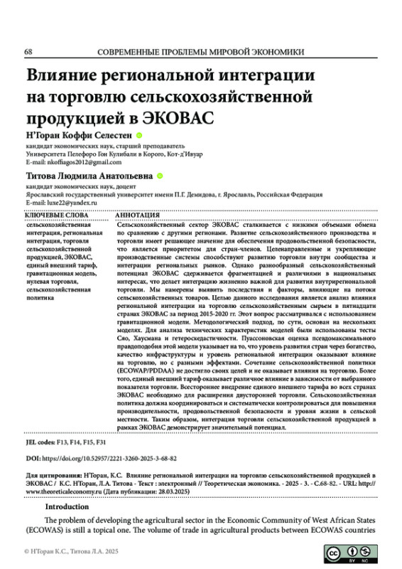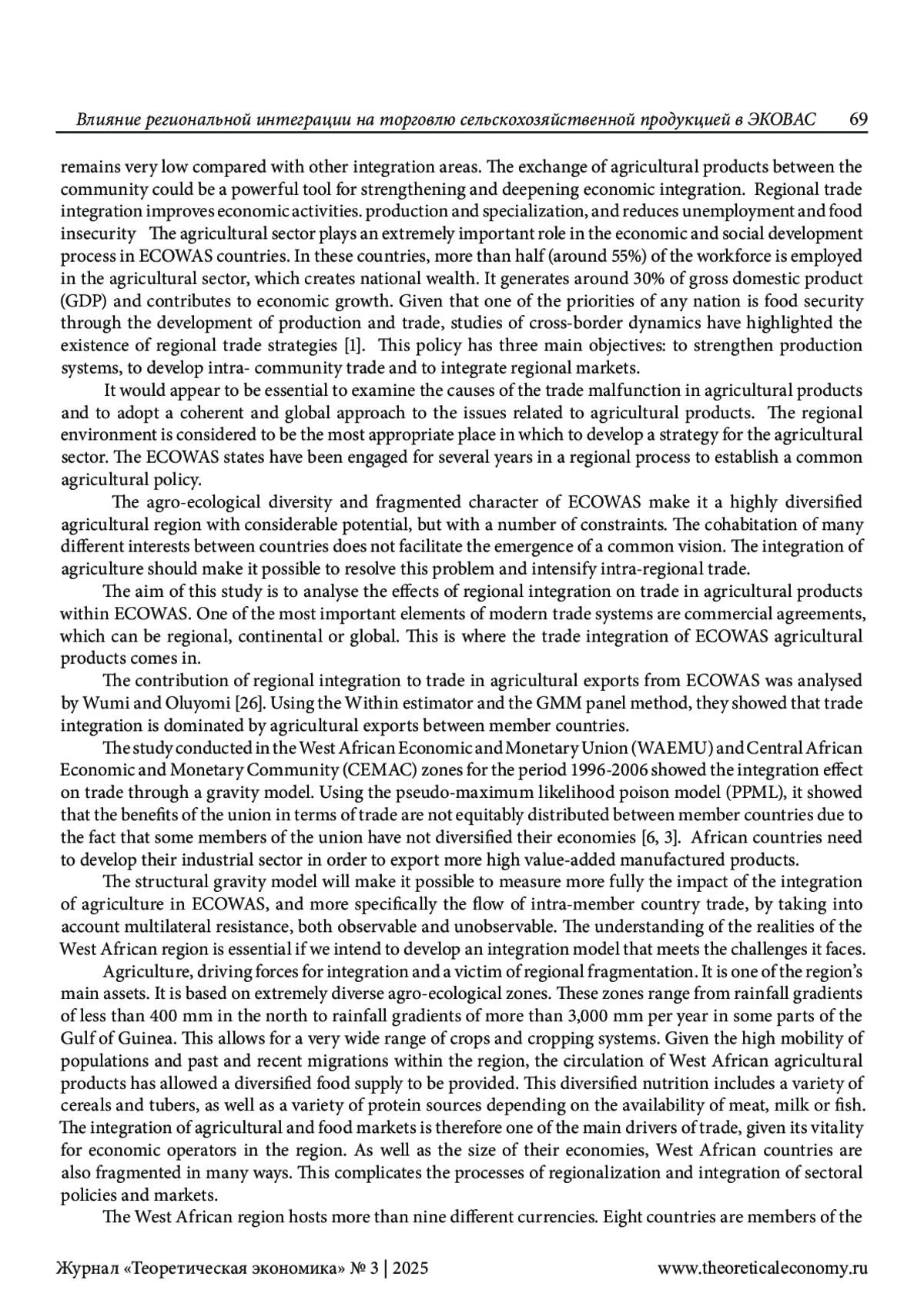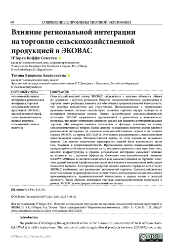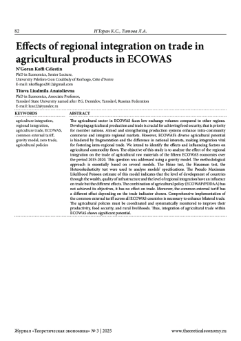 Сельскохозяйственный сектор ЭКОВАС сталкивается с низкими объемами обмена по сравнению с другими регионами. Развитие сельскохозяйственного производства и торговли имеет решающее значение для обеспечения продовольственной безопасности, что является приоритетом для стран-членов. Целенаправленные и укрепляющие производственные системы способствуют развитию торговли внутри сообщества и интеграции региональных рынков. Однако разнообразный сельскохозяйственный потенциал ЭКОВАС сдерживается фрагментацией и различиями в национальных интересах, что делает интеграцию жизненно важной для развития внутрирегиональной торговли. Мы намерены выявить последствия и факторы, влияющие на потоки сельскохозяйственных товаров. Целью данного исследования является анализ влияния региональной интеграции на торговлю сельскохозяйственным сырьем в пятнадцати странах ЭКОВАС за период 2015-2020 гг. Этот вопрос рассматривался с использованием гравитационной модели. Методологический подход, по сути, основан на нескольких моделях. Для анализа технических характеристик моделей были использованы тесты Сяо, Хаусмана и гетероскедастичности. Пуассоновская оценка псевдомаксимального правдоподобия этой модели указывает на то, что уровень развития стран через богатство, качество инфраструктуры и уровень региональной интеграции оказывают влияние на торговлю, но с разными эффектами. Сочетание сельскохозяйственной политики (ECOWAP/PDDAA) не достигло своих целей и не оказывает влияния на торговлю. Более того, единый внешний тариф оказывает различное влияние в зависимости от выбранного показателя торговли. Всестороннее внедрение единого внешнего тарифа во всех странах ЭКОВАС необходимо для расширения двусторонней торговли. Сельскохозяйственная политика должна координироваться и систематически контролироваться для повышения производительности, продовольственной безопасности и уровня жизни в сельской местности. Таким образом, интеграция торговли сельскохозяйственной продукцией в рамках ЭКОВАС демонстрирует значительный потенциал.