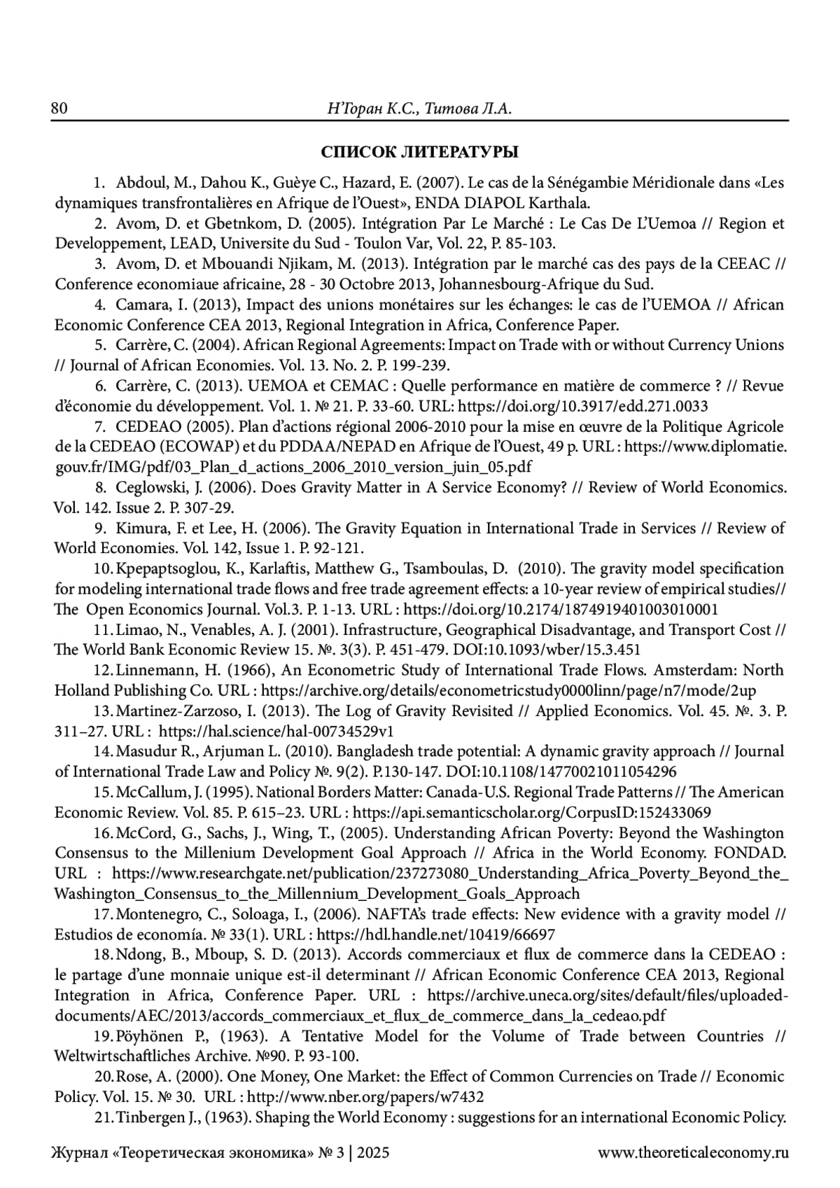 18. Ndong, B., Mboup, S. D. (2013). Accords commerciaux et flux de commerce dans la CEDEAO: le partage d’une monnaie unique est-il determinant // African Economic Conference CEA 2013, Regional Integration in Africa, Conference Paper. URL: https://archive.uneca.org/sites/default/files/uploaded-documents/AEC/2013/accords_commerciaux_et_flux_de_commerce_dans_la_cedeao.pdf.