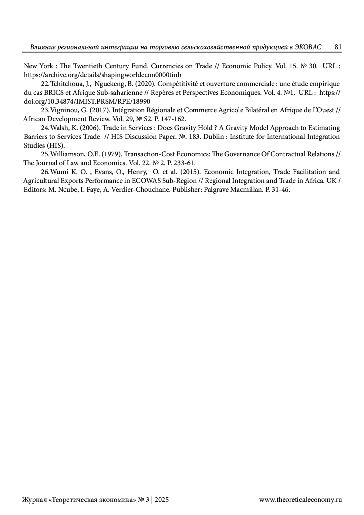 26. Wumi K. O., Evans, O., Henry, O. et al. (2015). Economic Integration, Trade Facilitation and Agricultural Exports Performance in ECOWAS Sub-Region // Regional Integration and Trade in Africa. UK / Editors: M. Ncube, I. Faye, A. Verdier-Chouchane. Publisher: Palgrave Macmillan. Р. 31-46.