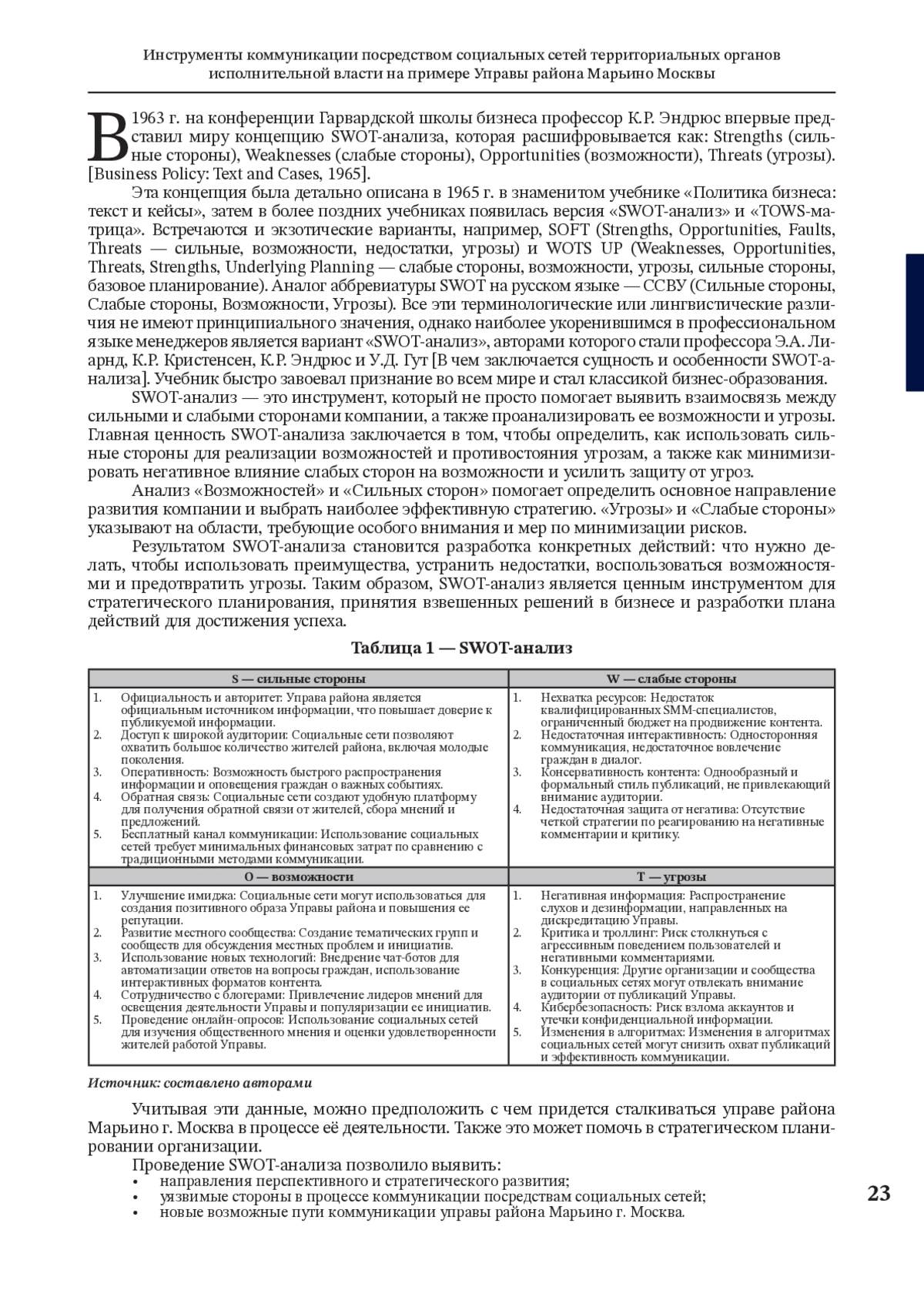 В данной статье описан процесс проведения исследования, направленного на сравнительный анализ подходов к разработке инструментов коммуникации посредством социальных сетей территориальных органов исполнительной власти. Проведенное нами исследование, основанное на методах SWOT- и PEST-анализа, а также сравнительном анализе коммуникационной активности территориальных органов исполнительной власти в социальных сетях, позволило выявить ключевые факторы, влияющие на эффективность деятельности Управы района Марьино г. Москва. SWOT-анализ показал наличие как сильных сторон, таких как официальный статус и авторитет, доступ к широкой аудитории и возможность оперативного распространения информации, так и слабых сторон, включающих ограниченность ресурсов, недостаточную интерактивность, однообразие формального стиля и недостаточную защиту от негатива. PEST-анализ выявил значимое влияние внешних факторов, таких как государственная политика в сфере местного самоуправления, политика Правительства Москвы, бюджетное финансирование, цифровизация государственных услуг, развитие электронного документооборота, развитие социальных сетей и мессенджеров. Сравнительный анализ коммуникационной активности территориальных органов исполнительной власти в социальных сетях продемонстрировал ряд системных проблем, таких как низкий уровень развития официальных сообществ, отсутствие системной работы с аудиторией и недостаточная численность и активность аудитории. На основании полученных данных мы пришли к выводу о необходимости разработки комплексной стратегии, направленной на повышение эффективности работы Управы района Марьино г. Москва.