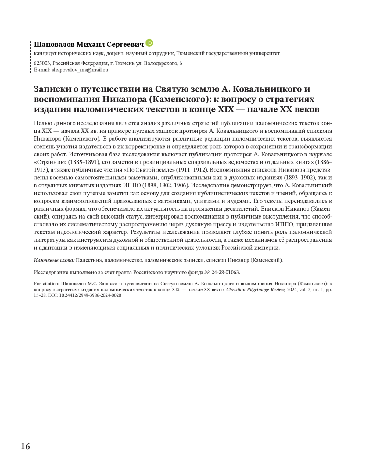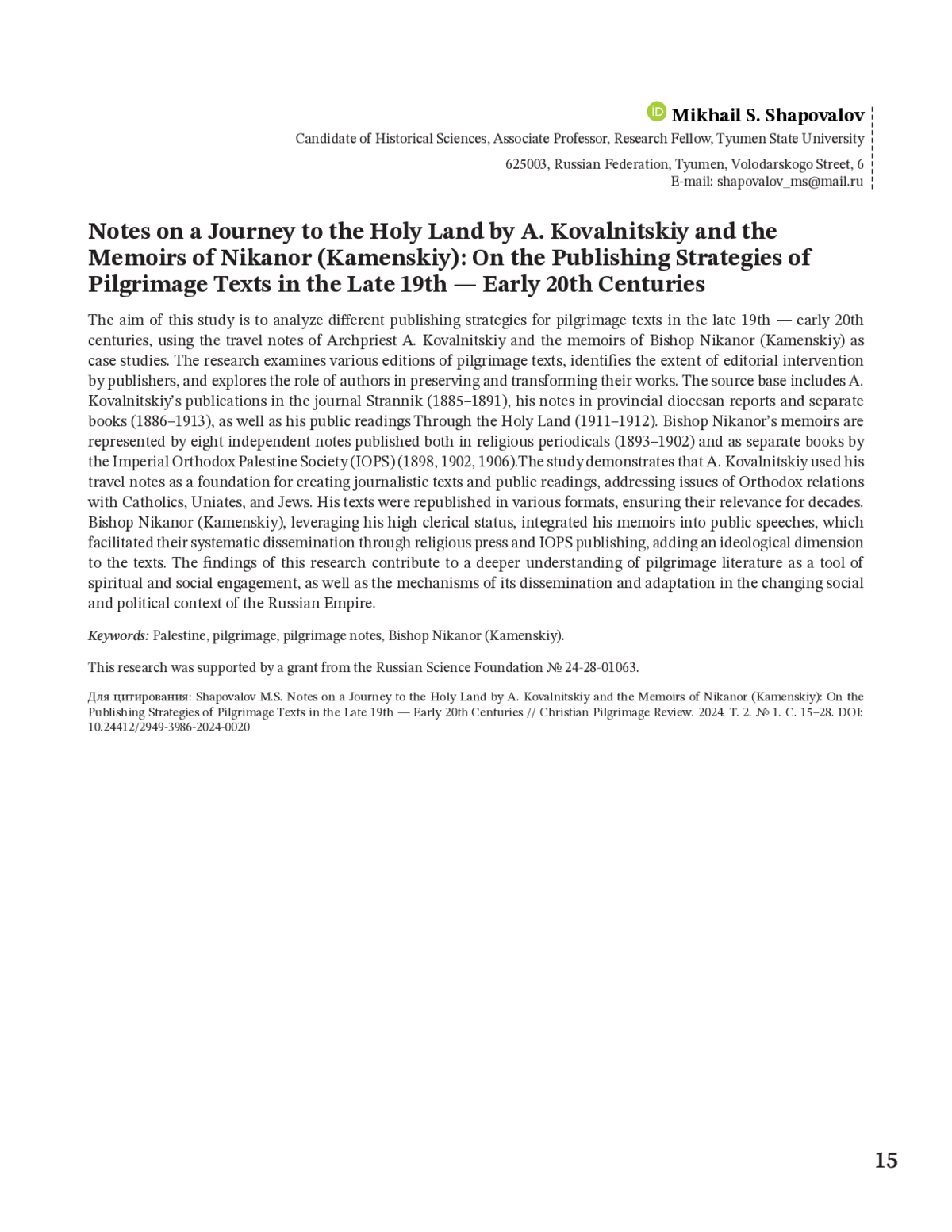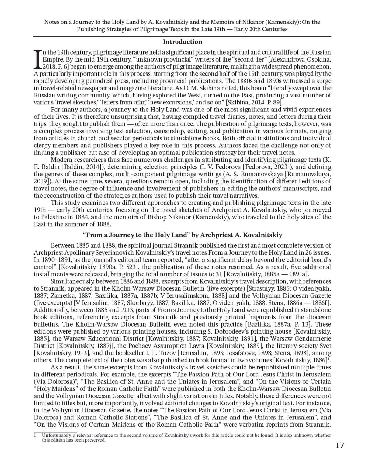 The aim of this study is to analyze different publishing strategies for pilgrimage texts in the late 19th — early 20th centuries, using the travel notes of Archpriest A. Kovalnitskiy and the memoirs of Bishop Nikanor (Kamenskiy) as case studies. The research examines various editions of pilgrimage texts, identifies the extent of editorial intervention by publishers, and explores the role of authors in preserving and transforming their works. The source base includes A. Kovalnitskiy’s publications in the journal Strannik (1885–1891), his notes in provincial diocesan reports and separate books (1886–1913), as well as his public readings Through the Holy Land (1911–1912). Bishop Nikanor’s memoirs are represented by eight independent notes published both in religious periodicals (1893–1902) and as separate books by the Imperial Orthodox Palestine Society (IOPS) (1898, 1902, 1906). The study demonstrates that A. Kovalnitskiy used his travel notes as a foundation for creating journalistic texts and public readings, addressing issues of Orthodox relations with Catholics, Uniates, and Jews. His texts were republished in various formats, ensuring their relevance for decades. Bishop Nikanor (Kamenskiy), leveraging his high clerical status, integrated his memoirs into public speeches, which facilitated their systematic dissemination through religious press and IOPS publishing, adding an ideological dimension to the texts. The findings of this research contribute to a deeper understanding of pilgrimage literature as a tool of spiritual and social engagement, as well as the mechanisms of its dissemination and adaptation in the changing social and political context of the Russian Empire.