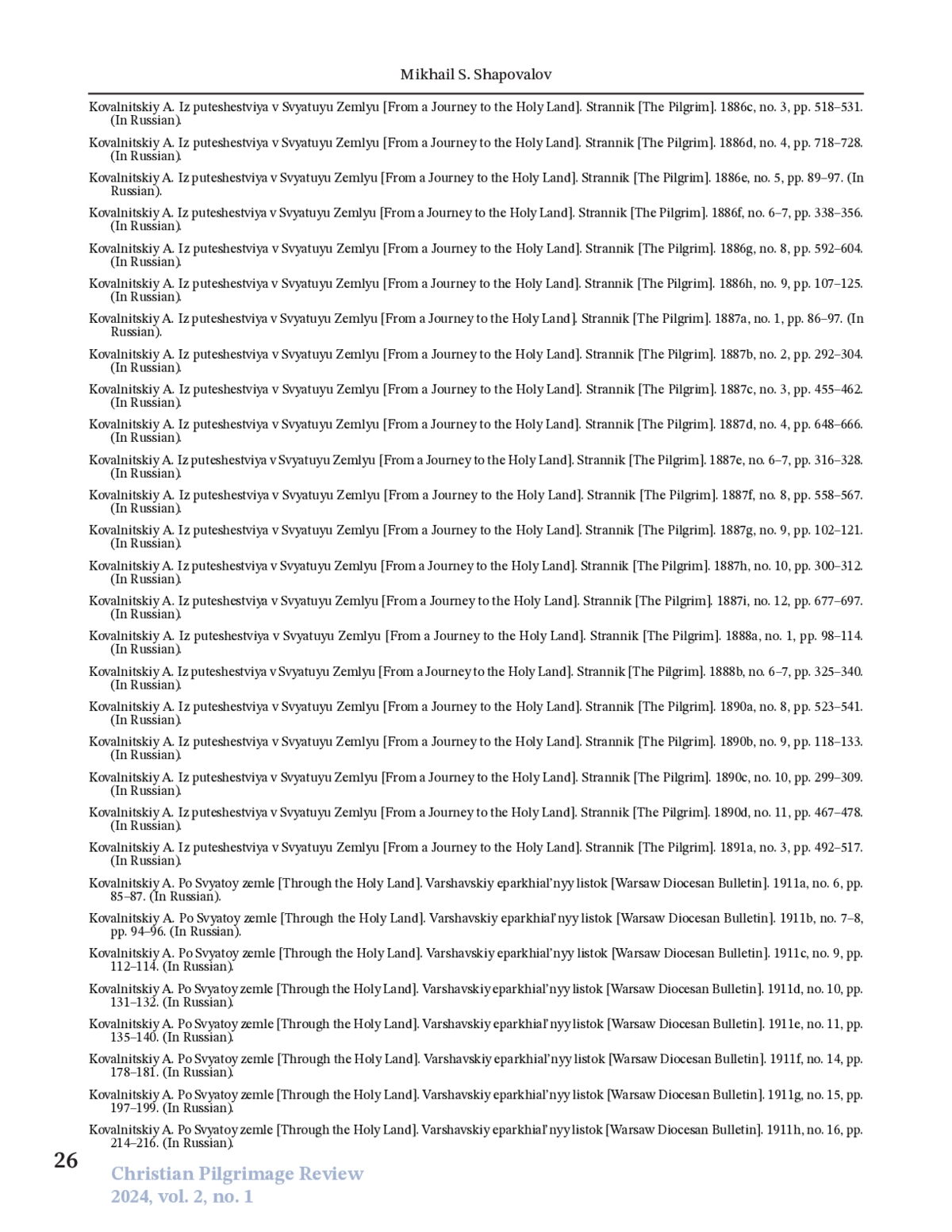 30. Kovalnitskiy A. Iz puteshestviya v Svyatuyu Zemlyu [From a Journey to the Holy Land]. Strannik [The Pilgrim]. 1886b, no. 2, pp. 270-287. (In Russian).