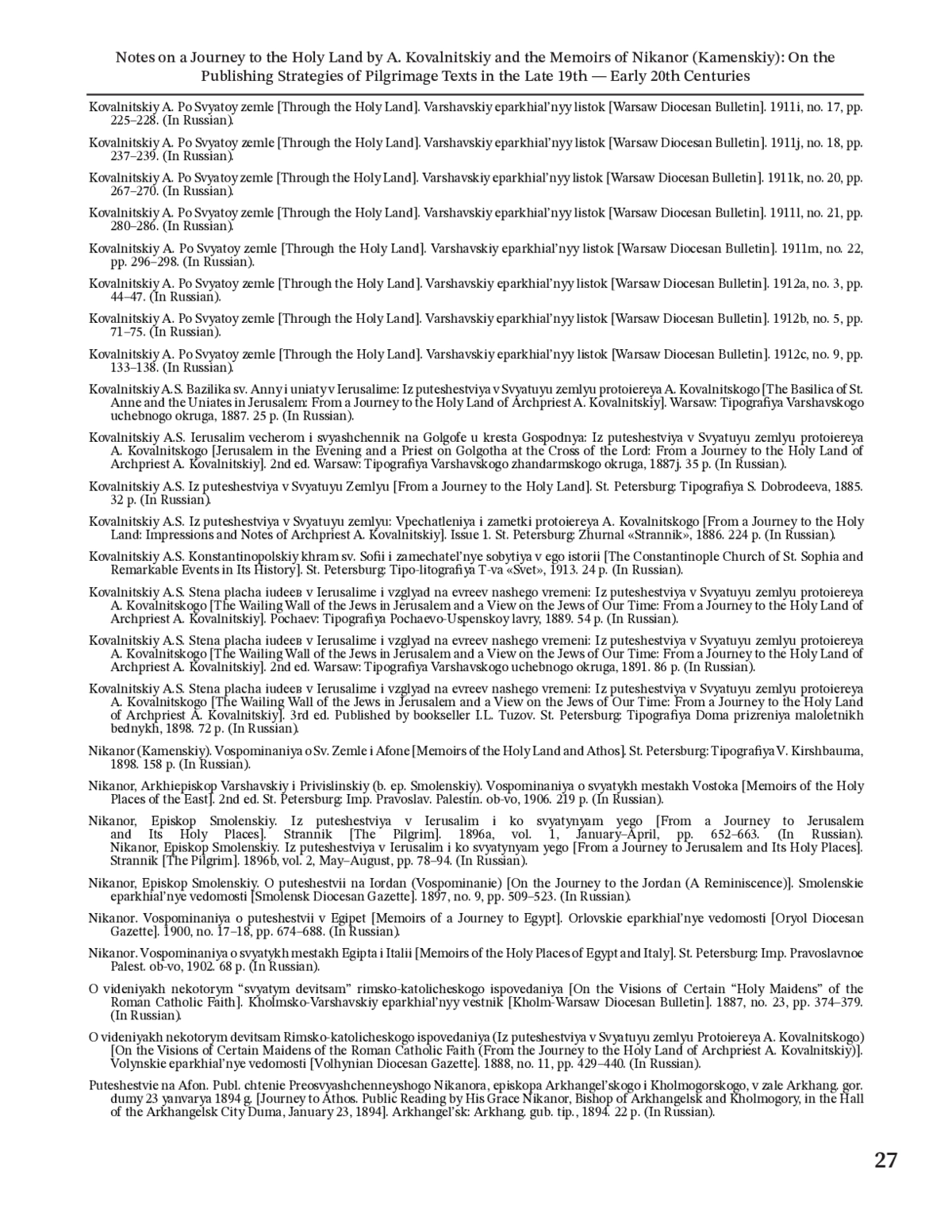 48. Kovalnitskiy A. Iz puteshestviya v Svyatuyu Zemlyu [From a Journey to the Holy Land]. Strannik [The Pilgrim]. 1890a, no. 8, pp. 523-541. (In Russian).