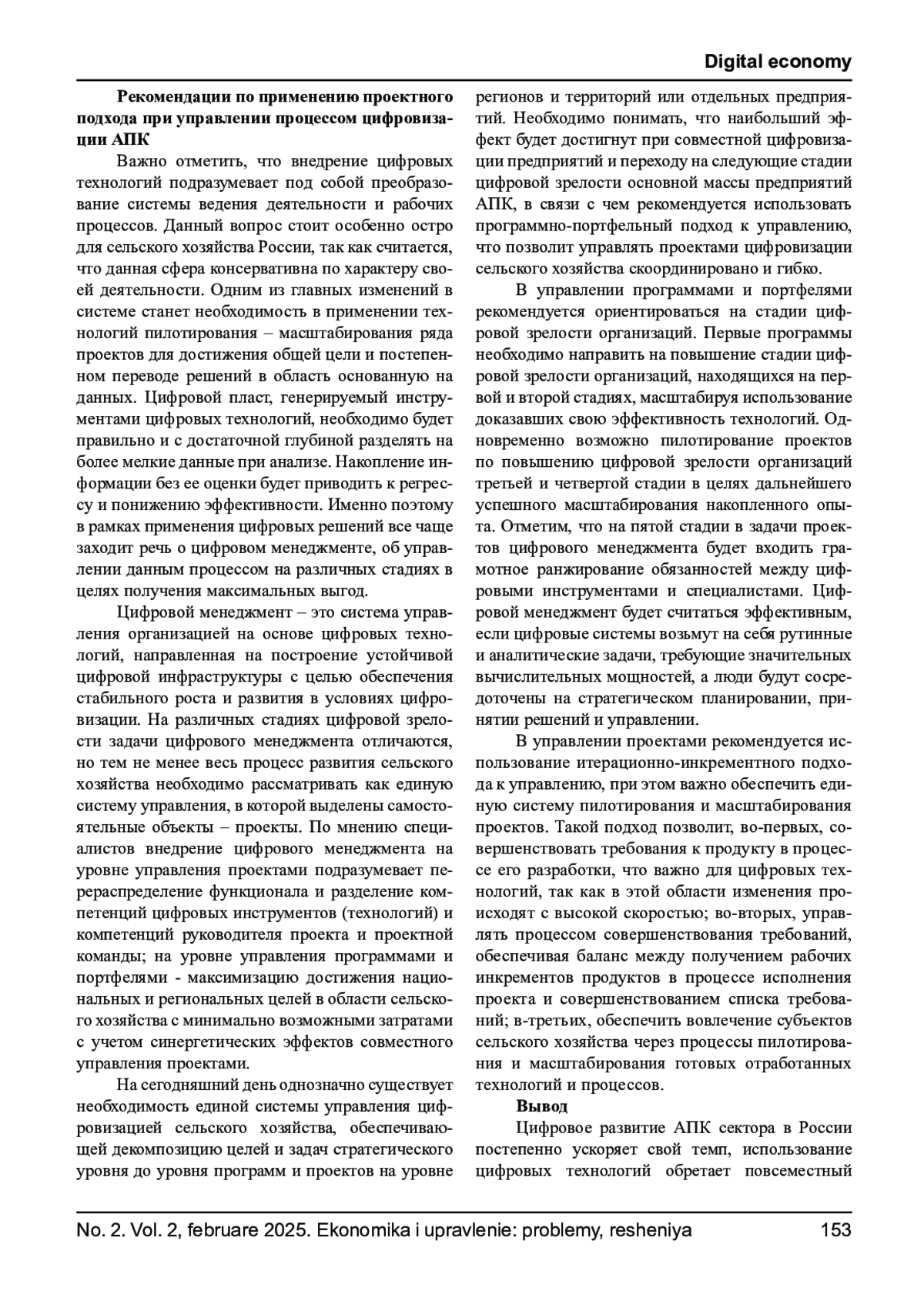 Четвертая промышленная революция, основу которой составляет широкомасштабное использование систем цифровых решений, заставляет трансформироваться привычные и знакомые методы управления проектами. В России эти изменения оказывают существенные влияния не только на организацию промышленности, но и на сектор сельского хозяйства. С ростом численности населения планеты следует растущий спрос на продукты растительного и животного происхождения. Для управления такими объемами потребления необходимо осваивать технологии, способные в момент времени обрабатывать и классифицировать массивы информации. Применение практик проектного управления, которые являются общепризнанными стандартами ведения деятельности, теперь сопровождается задействованием искусственного интеллекта и цифровых инструментов. Данная работа рассматривает текущую трансформацию процессов управления российским агропромышленным комплексом и оценивает его цифровую зрелость, степень внедрения технологий новой волны промышленной революции в контексте проектного управления, что позволяет сформулировать рекомендации в области развития теории и практики проектного подхода в сфере сельского хозяйства.