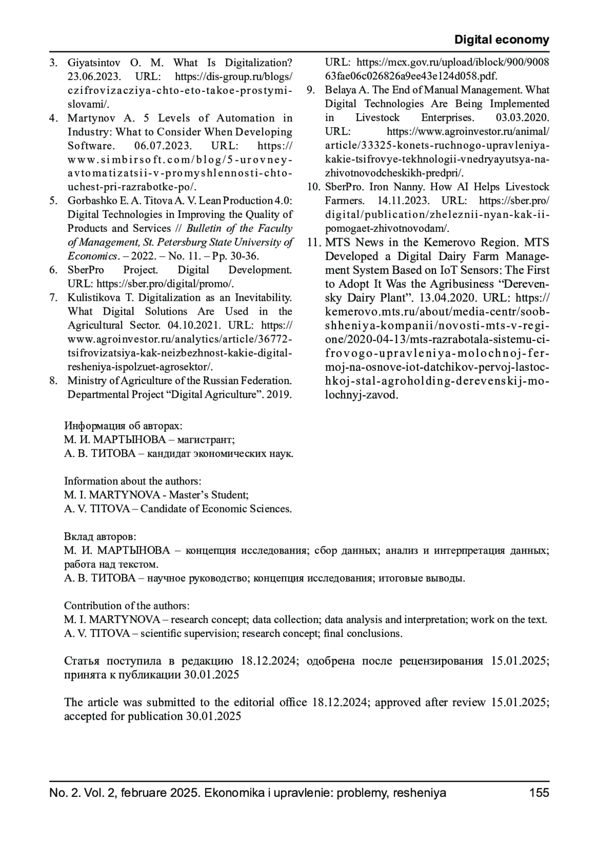 9. Белая А. Конец ручного управления. Какие цифровые технологии внедряются на животноводческих предприятиях. 03.03.2020. URL: https://www.agroinvestor.ru/animal/article/33325-konets-ruchnogo-upravleniya-kakie-tsifrovye-tekhnologii-vnedryayutsya-na-zhivotnovodcheskikh-predpri.