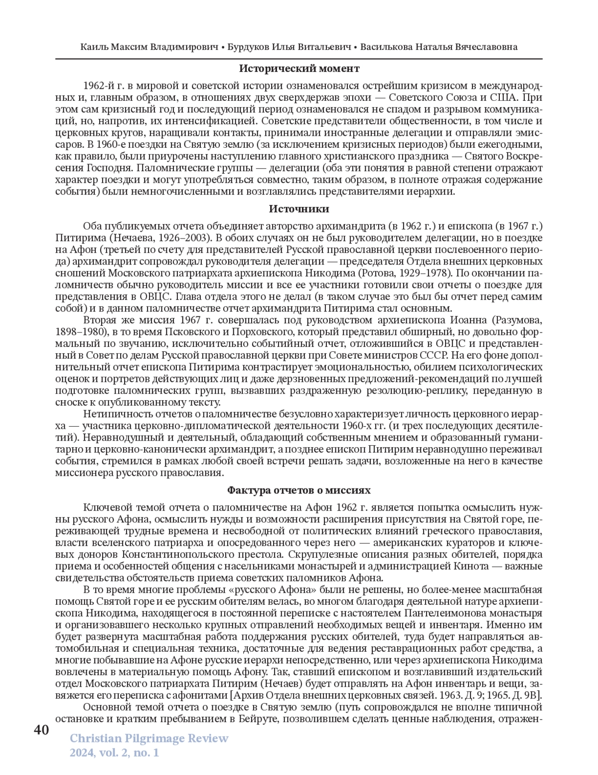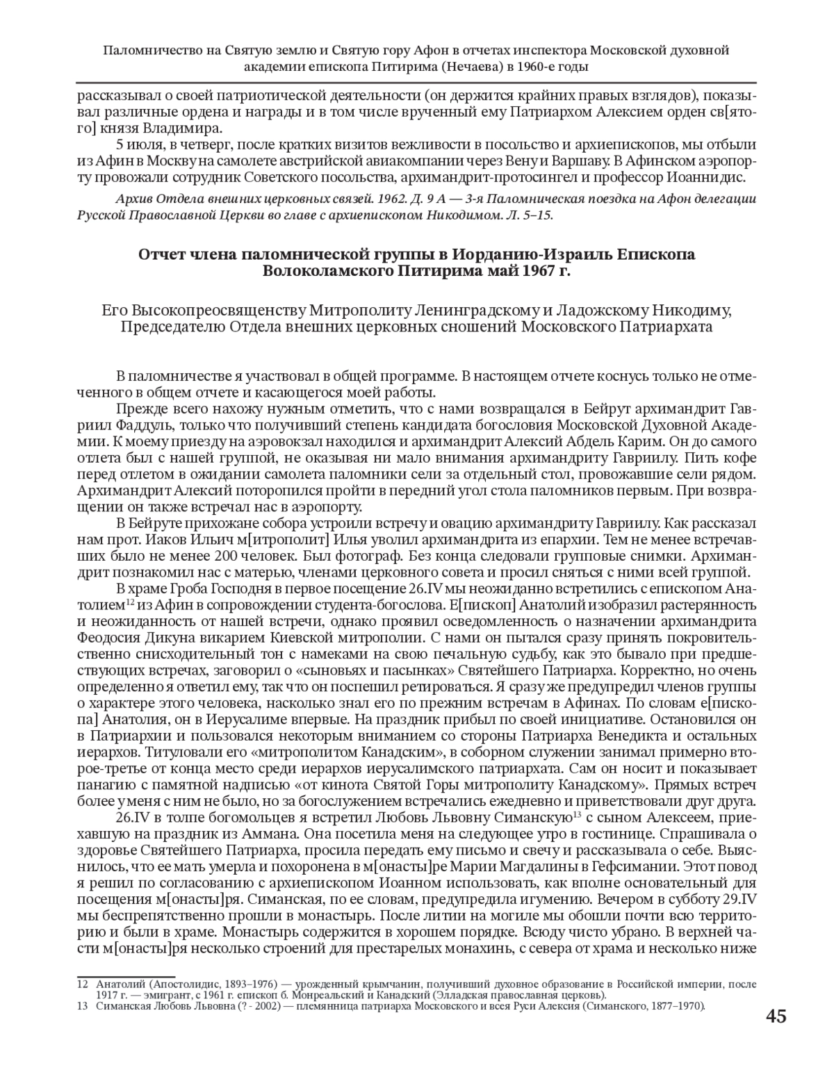 Статья с публикацией источников посвящена реконструкции обстоятельств и хода одного из первых «паломничеств» в Святую землю и на Афон представителей Московского патриархата Русской православной церкви. После возобновления контактов со Святой землей, произошедшего после первого посещения христианских святынь и восточных патриархов патриархом Алексием (Симанским) в мае-июне 1945 г. начались периодические контакты и ежегодные миссии, носившие официальное именование паломничества. Разумеется, это традиционное в христианском мире выражение религиозного чувства в условиях советской действительности и полного государственного контроля за контактами с заграницей претерпевало решительные изменения. Документы свидетельствуют, что отправлявшиеся в Иерусалим и на Афон православные переживали религиозный опыт, запечатленный в их сознании (и в очень редких случаях в личных записях — антропологически насыщенных источниках), но в гораздо более явленной форме такое паломничество представляло миссию, в которой сочетались как церковные мотивы (поддержание молитвенного общения, исторических и действительных современных контактов, расширение юрисдикции и канонического влияния), так и государственные дипломатические задачи (установление контактов и расширение круга лояльных и готовых ко взаимодействую с советскими церковными и государственными — политико-дипломатическими структурами и представителями). Само паломничество — миссия сопровождалось большим количеством формальностей, от паспортно-визового и финансового (валютного) обеспечения до многоступенчатой отчетности. Одним из принятых жанров была подготовка обстоятельного отчета по итогам поездки. Такие отчеты откладывались на хранение в Отделе внешних церковных сношений, направлялись в Совет по делам Русской православной церкви при Совете министров СССР. Несмотря на очевидное влияние самоцензуры авторов такие отчеты являются уникальными по полноте фактологической фиксации и фактически единственными источниками, позволяющими воссоздать историю особых паломничеств советской эпохи.