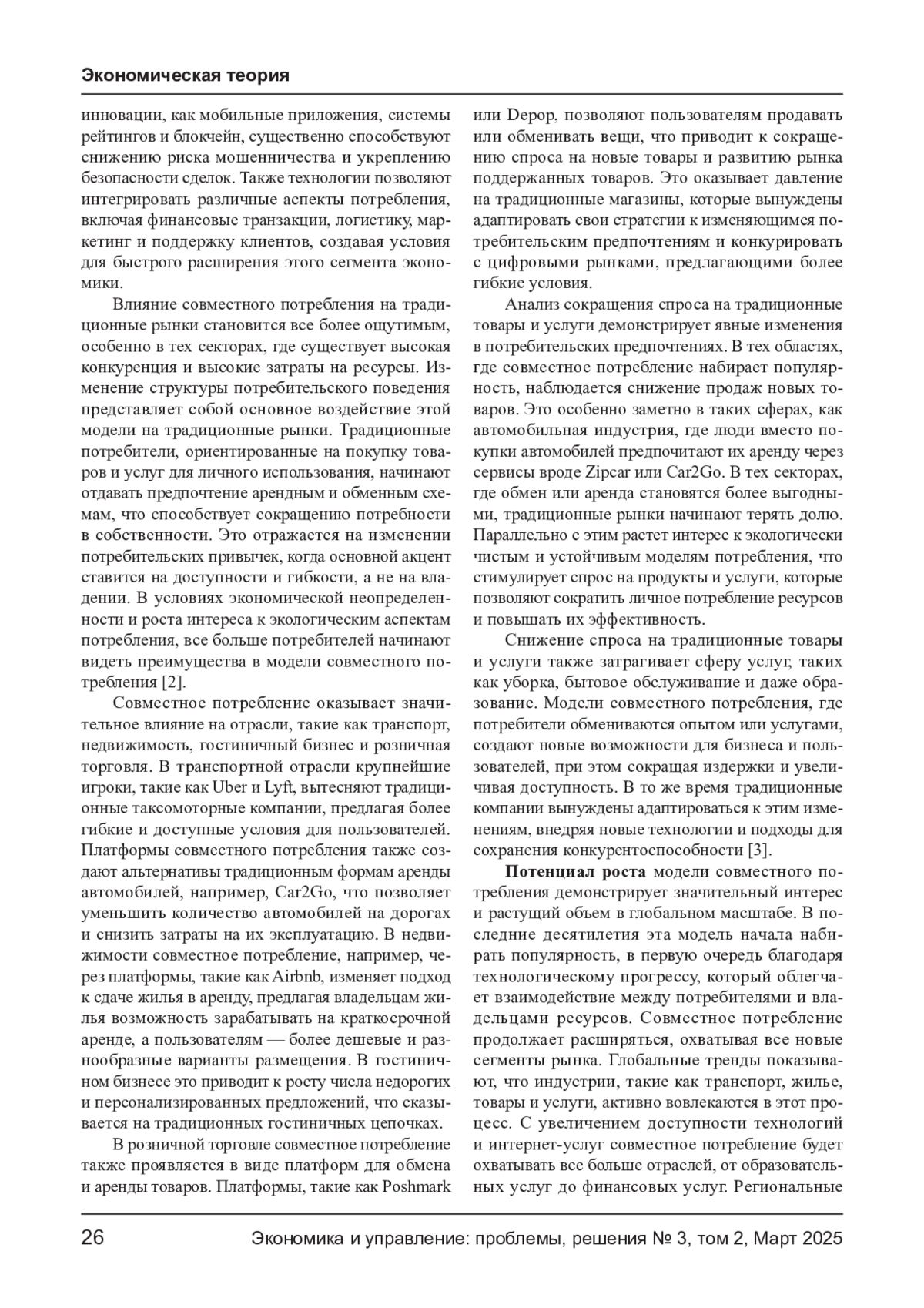 Статья рассматривает феномен совместного потребления как важный фактор, влияющий на развитие традиционных рынков. Совместное потребление, выражающееся в обмене товарами и услугами между потребителями через цифровые платформы, трансформирует бизнес- модели и потребительские практики. В исследовании анализируются основные направления воздействия этой модели на ключевые отрасли экономики, а также перспективы ее дальнейшего развития. Особое внимание уделяется вызовам, с которыми сталкиваются традиционные компании в условиях конкуренции с платформами совместного потребления, включая вопросы регулирования, безопасности и изменения потребительского поведения. Статья подчеркивает важность учета социальных, экологических и технологических аспектов при адаптации существующих рынков к новым условиям.