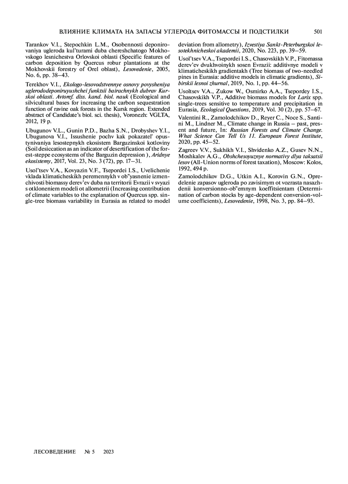 35. Usoltsev V.A., Zukow W., Osmirko A.A., Tsepordey I.S., Chasovskikh V.P. Additive biomass models for Larix spp. single-trees sensitive to temperature and precipitation in Eurasia // Ecological Questions. 2019. V. 30 (2). P. 57–67. EDN: TJCCXE