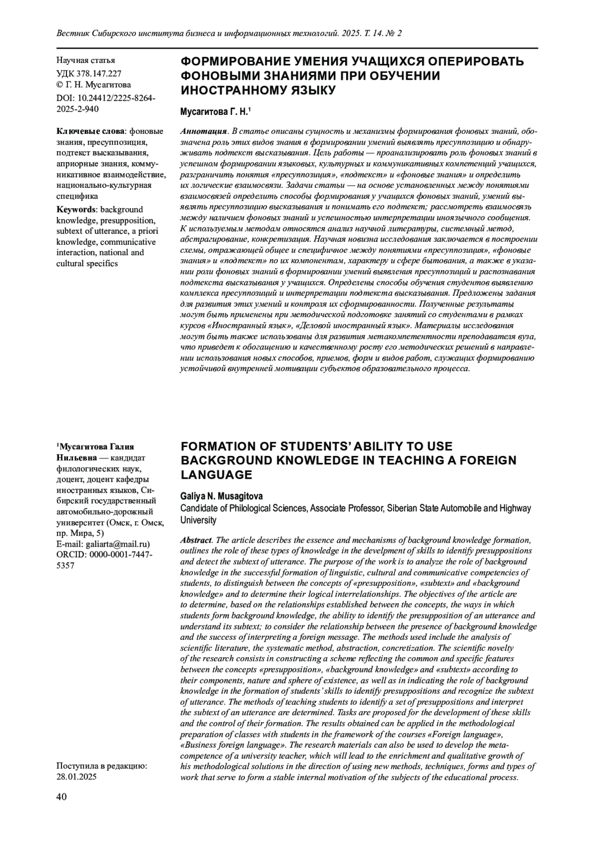 В статье описаны сущность и механизмы формирования фоновых знаний, обозначена роль этих видов знания в формировании умений выявлять пресуппозицию и обнаруживать подтекст высказывания. Цель работы — проанализировать роль фоновых знаний в успешном формировании языковых, культурных и коммуникативных компетенций учащихся, разграничить понятия «пресуппозиция», «подтекст» и «фоновые знания» и определить их логические взаимосвязи. Задачи статьи — на основе установленных между понятиями взаимосвязей определить способы формирования у учащихся фоновых знаний, умений выявлять пресуппозицию высказывания и понимать его подтекст; рассмотреть взаимосвязь между наличием фоновых знаний и успешностью интерпретации иноязычного сообщения. К используемым методам относятся анализ научной литературы, системный метод, абстрагирование, конкретизация. Научная новизна исследования заключается в построении схемы, отражающей общее и специфичное между понятиями «пресуппозиция», «фоновые знания» и «подтекст» по их компонентам, характеру и сфере бытования, а также в указании роли фоновых знаний в формировании умений выявления пресуппозиций и распознавания подтекста высказывания у учащихся. Определены способы обучения студентов выявлению комплекса пресуппозиций и интерпретации подтекста высказывания. Предложены задания для развития этих умений и контроля их сформированности. Полученные результаты могут быть применены при методической подготовке занятий со студентами в рамках курсов «Иностранный язык», «Деловой иностранный язык». Материалы исследования могут быть также использованы для развития метакомпетентности преподавателя вуза, что приведет к обогащению и качественному росту его методических решений в направлении использования новых способов, приемов, форм и видов работ, служащих формированию устойчивой внутренней мотивации субъектов образовательного процесса.