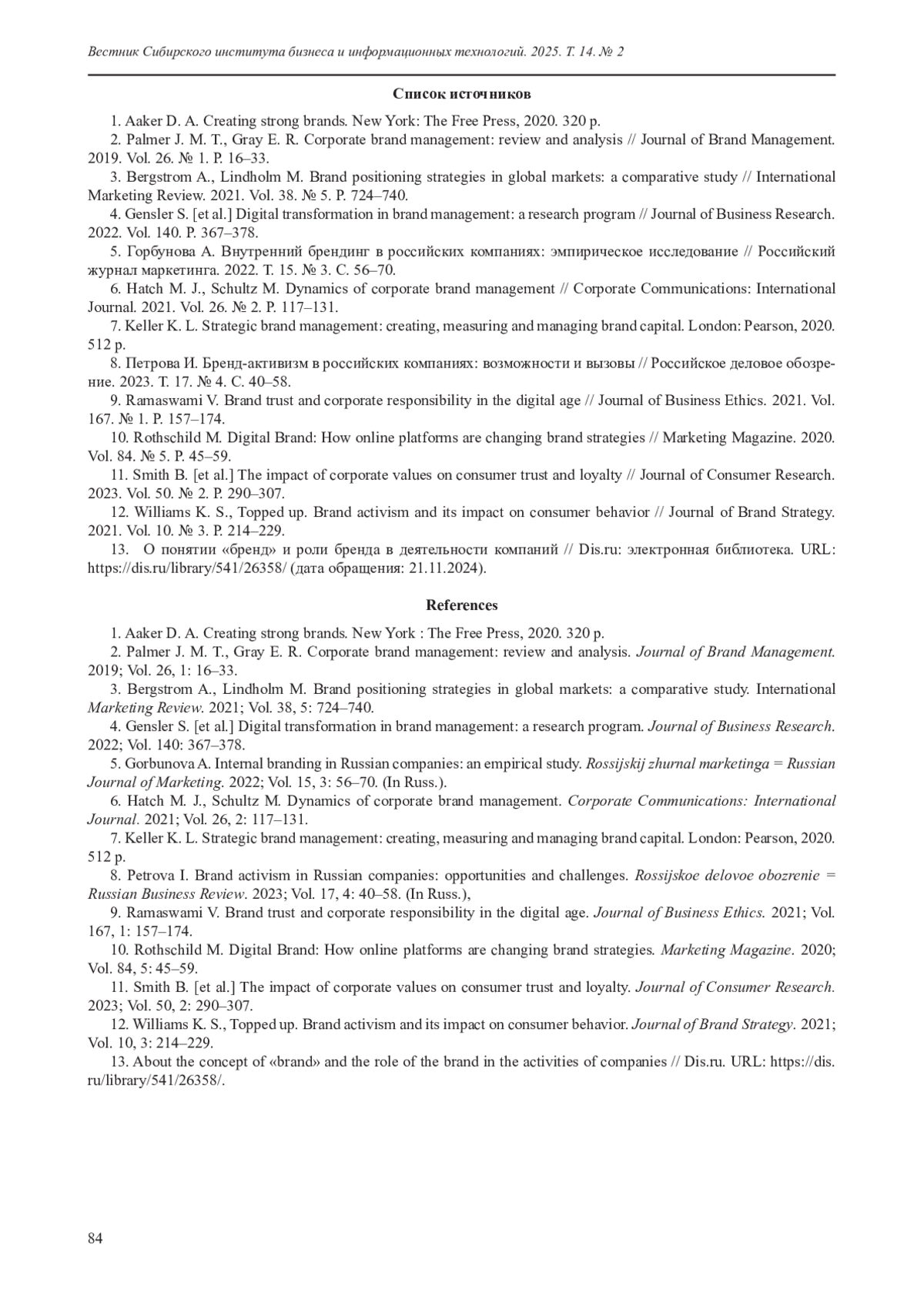 8. Петрова И. Бренд-активизм в российских компаниях: возможности и вызовы // Российское деловое обозрение. 2023. Т. 17. № 4. С. 40-58.