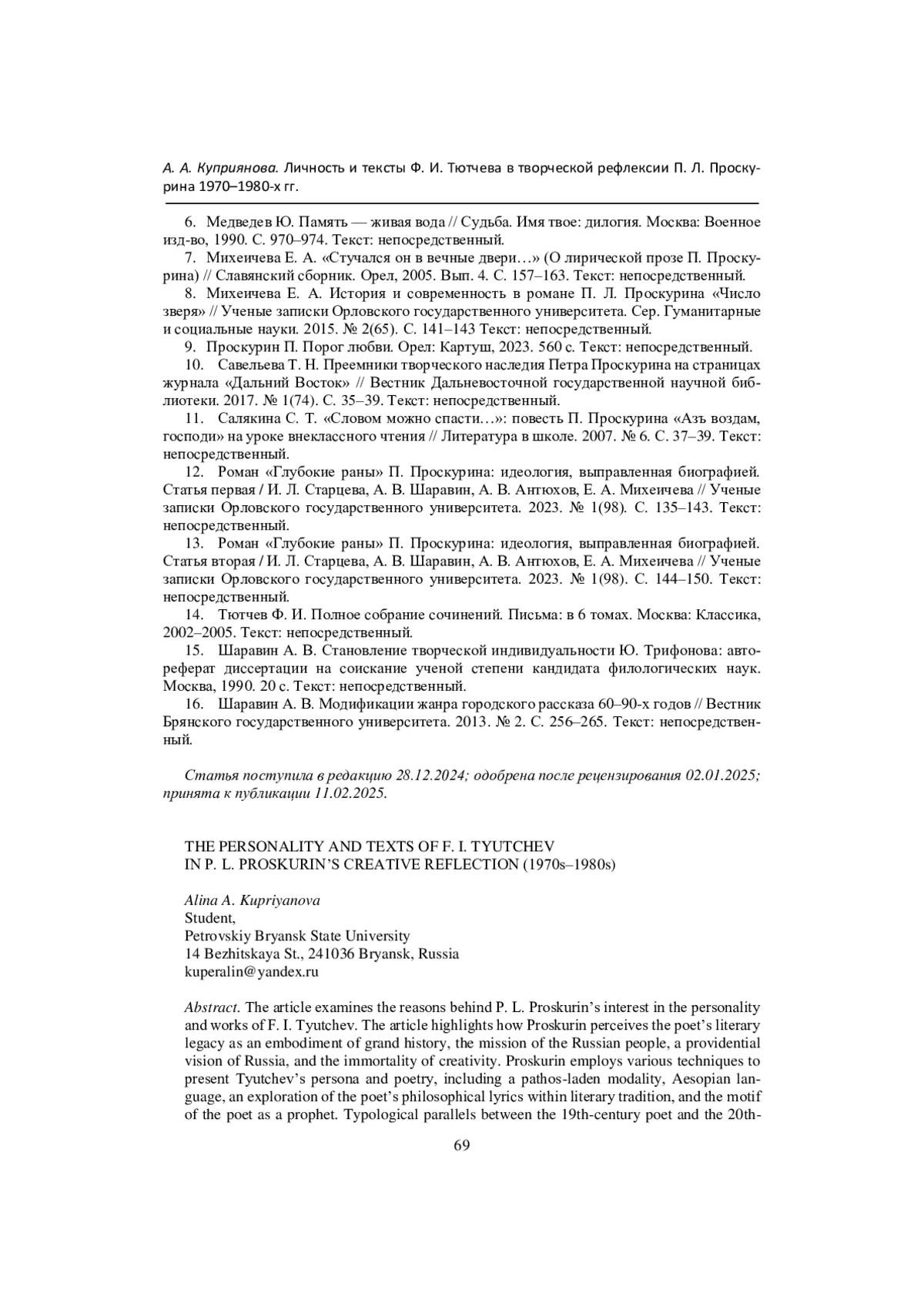 1. Большакова А. Ю. Почвенничество и символический реализм В. П. Астафьева и В. Г. Распутина // Проблемы исторической поэтики. 2023. Т. 21, № 3. С. 303-327. Текст: непосредственный. EDN: ZFCVGC