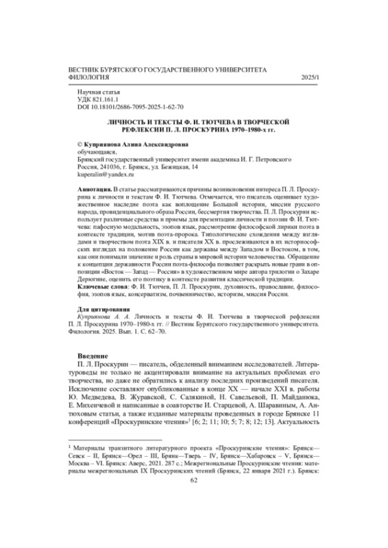 В статье рассматриваются причины возникновения интереса П. Л. Проскурина к личности и текстам Ф. И. Тютчева. Отмечается, что писатель оценивает художественное наследие поэта как воплощение Большой истории, миссии русского народа, провиденциального образа России, бессмертия творчества. П. Л. Проскурин использует различные средства и приемы для презентации личности и поэзии Ф. И. Тютчева: пафосную модальность, эзопов язык, рассмотрение философской лирики поэта в контексте традиции, мотив поэта-пророка. Типологические схождения между взглядами и творчеством поэта ХРХ в. и писателя ХХ в. прослеживаются в их историософских взглядах на положение России как державы между Западом и Востоком, в том, как они понимали значение и роль страны в мировой истории человечества. Обращение к концепции державности России поэта-философа позволяет раскрыть новые грани в оппозиции «Восток - Запад - Россия» в художественном мире автора трилогии о Захаре Дерюгине, оценить его поэтику в контексте развития классической традиции.